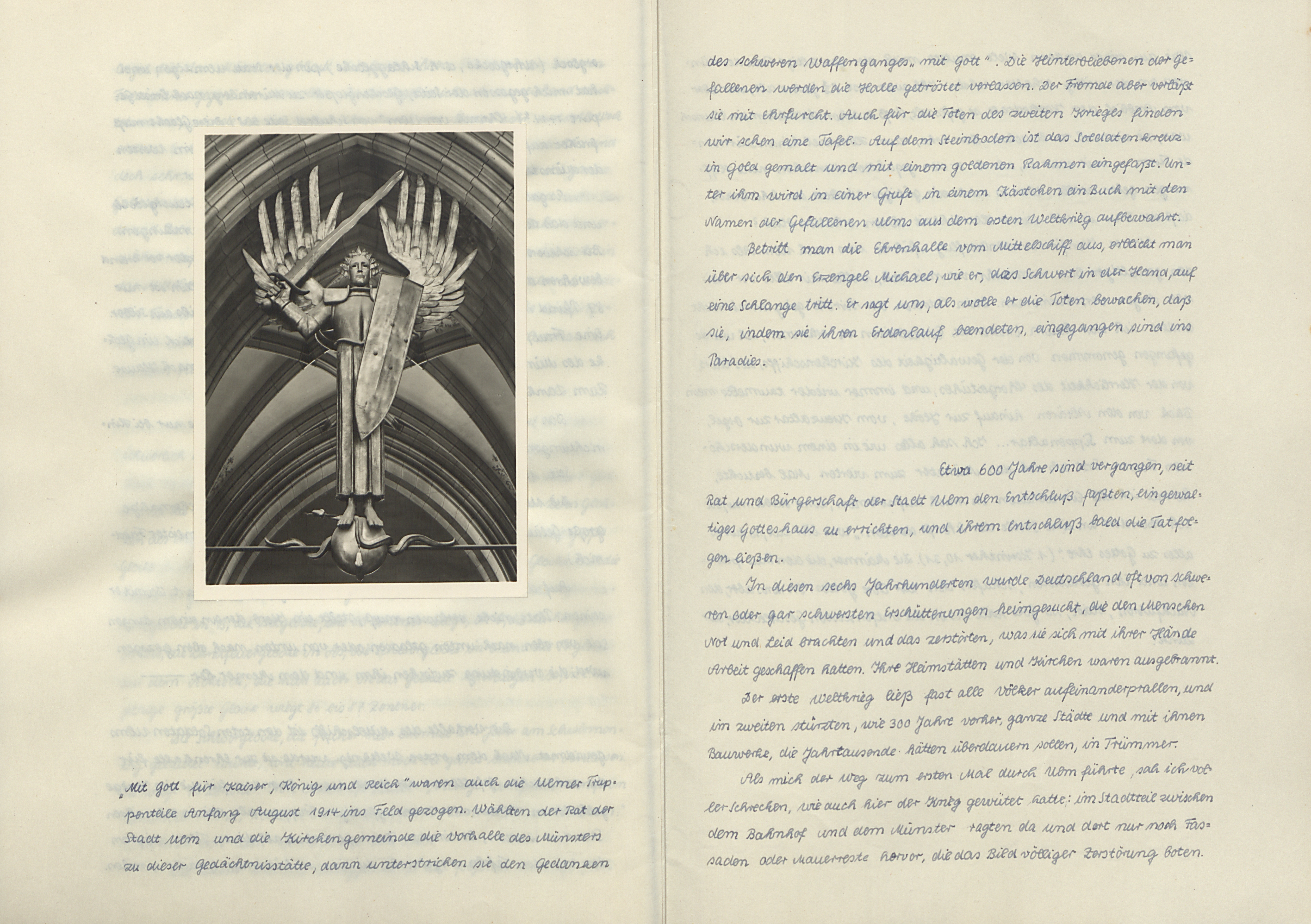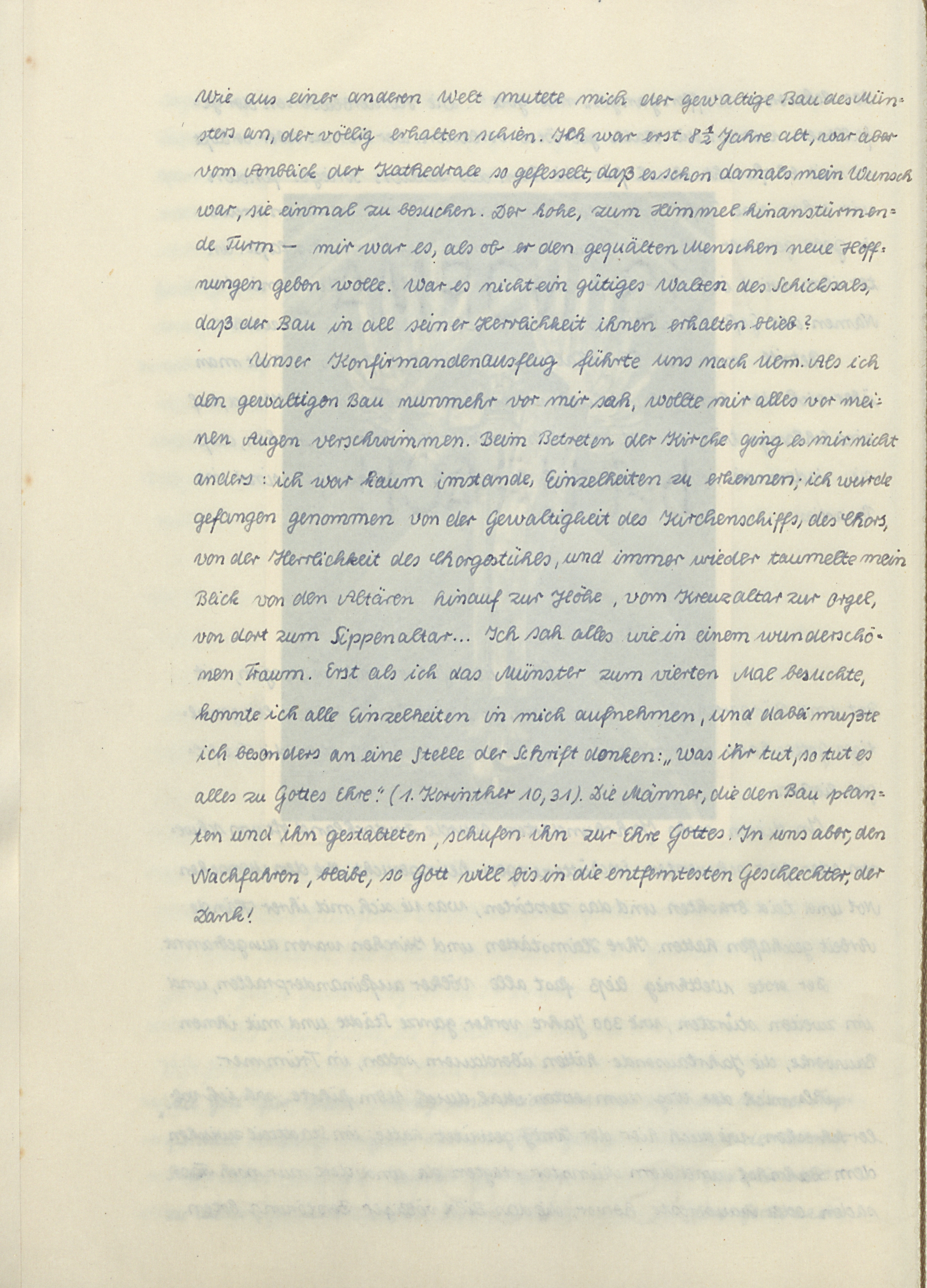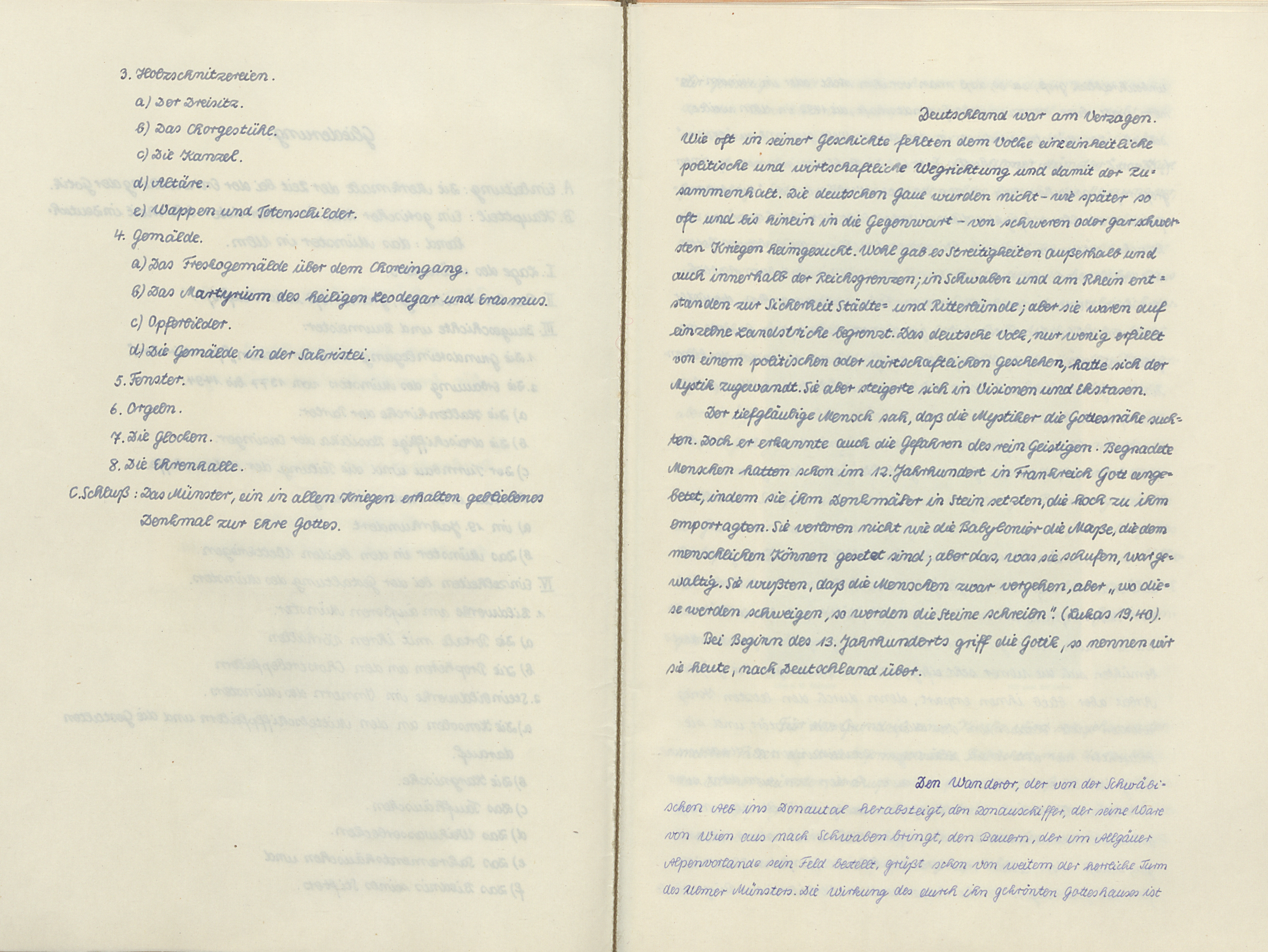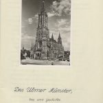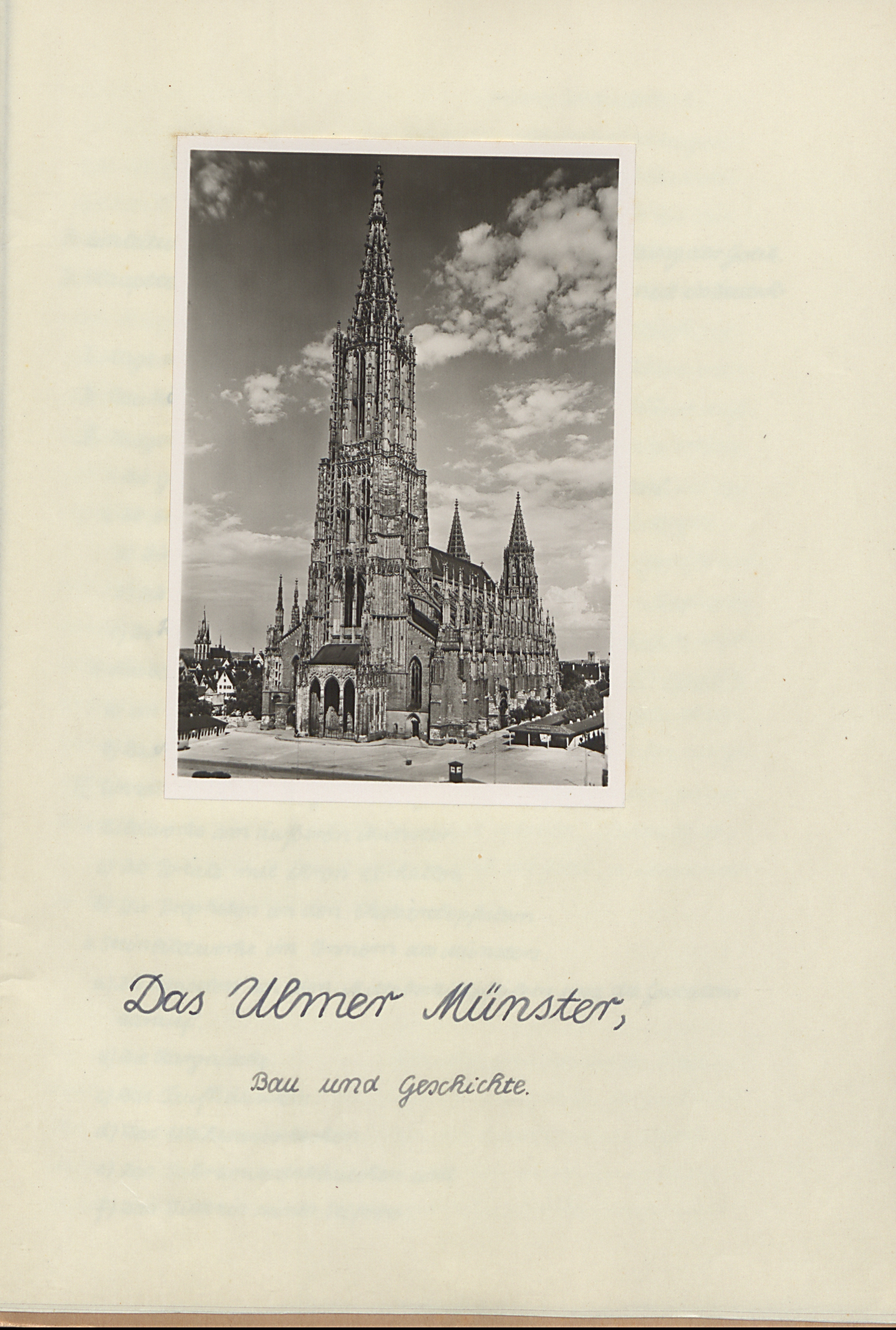 Bereits etwas vergilbt, aber liebevoll per Hand gebunden, liegt die Hausarbeit einer Schülerin der Mädchenoberschule Esslingen von November 1953 vor. In feinster Handschrift ausgeführt, handelt die Arbeit vom Ulmer Münster, seiner Architektur und Geschichte. Ergänzt wird der Text, der in einer Sprachfeinheit verfasst wurde, die heutzutage universitätswürdig wäre, durch eingeklebte Postkarten und Bilder. Die formale Struktur der Arbeit hätte am Computer nicht besser erstellt werden können: die Untergliederungspunkte wurden eingerückt, ebenso wie die Anfänge eines jeden Absatz. Es scheint auch so, als hätte die Verfasserin den Text bereits vorgeschrieben und ihn dann in die vorliegende Form übertragen, denn es sind wenige Korrektur, keine Streichungen oder Ähnliches zu erkennen. Dieses Fundstück aus dem Bestand der Ulmer Münsterbauhütte inspiriert und regt zum Nachdenken an: über das Zeitalter der Digitalisierung, in der die Handschrift immer mehr an Bedeutung verliert, ein jeder aber auch froh darüber ist, seine schriftlichen Arbeiten, ob in der Schule oder der Universität, nicht mehr mühsam per Hand schreiben und übertragen zu müssen; über die Wirkung und Aura von Objekten, die zeigen, wie viel Herzblut ihr Schöpfer in ihre Kreation gesteckt hat; und zuletzt über Bildung, die heute in Deutschland für Männer wie Frauen selbstverständlich ist, 1953 für Mädchen aber noch etwas Wunderbares und nicht Alltägliches war.