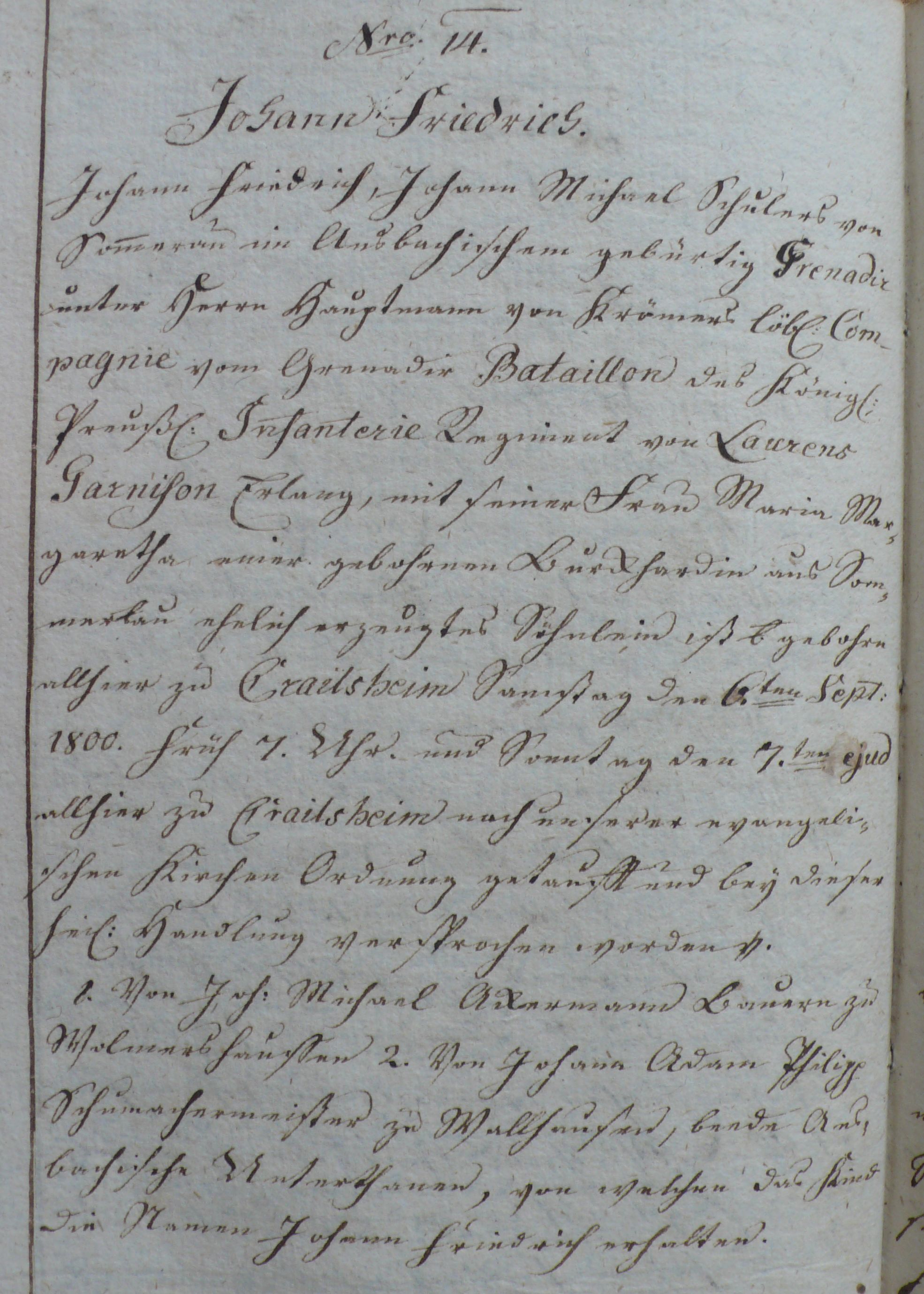 Taufeintrag vom 7. September 1800 mit umfangreichen Angaben zu den Eltern – der Vater ist aus der Garnison Erlangen (so schön geschrieben sind leider nur wenige der Einträge).