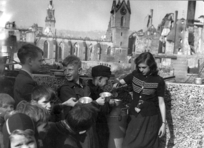 Kinderspeisung vor der zerstörten Leonhardskirche, 1946. Fotograf: Willi Essig (Landeskirchliches Archiv, Nr. 9178)