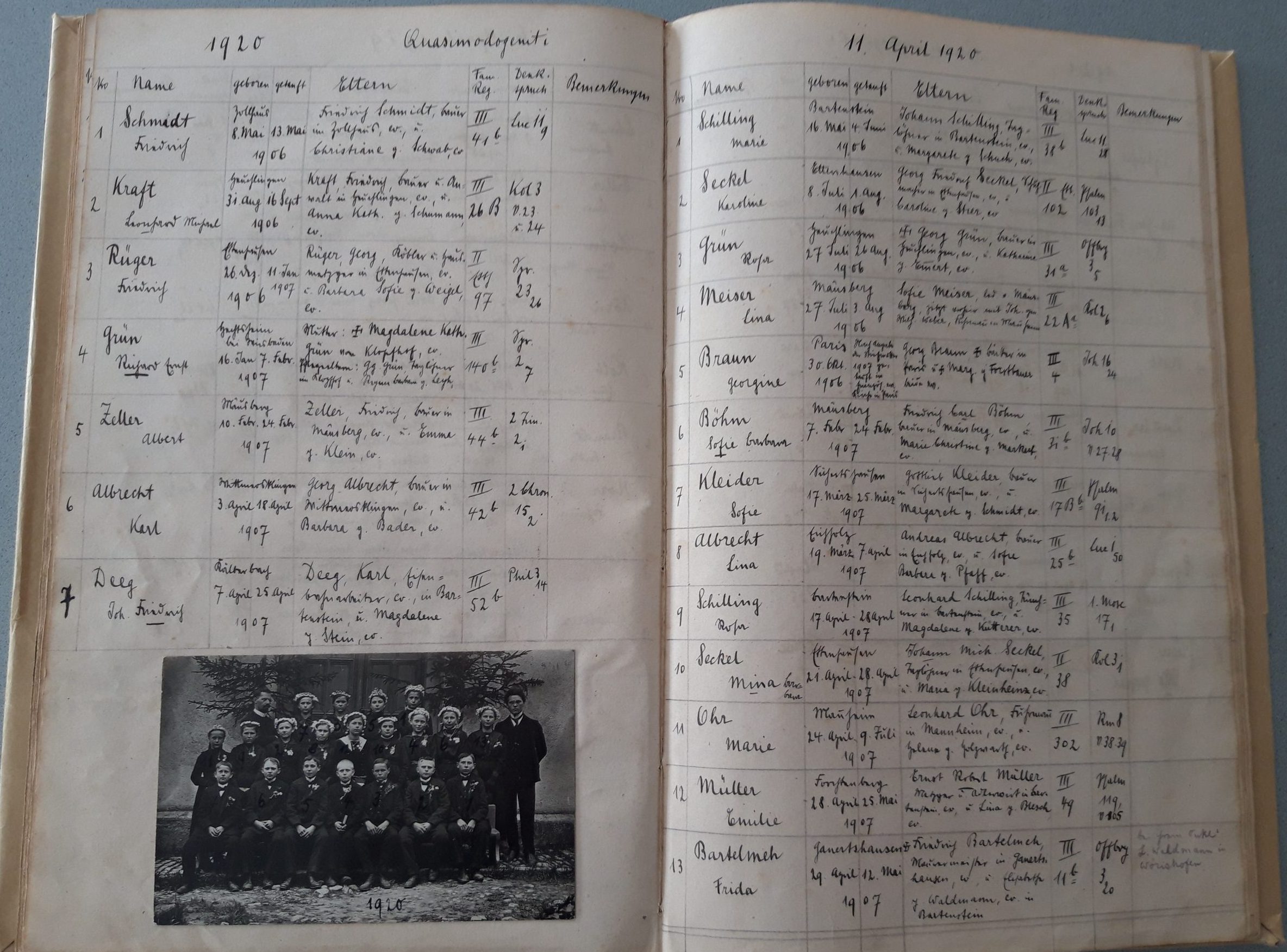 Bei einer Recherche für das Pfarramt Ettenhausen im Dekanatamt Blaubeuren fiel auf, dass im entsprechenden Konfirmandenregister für die Zeit von 1864 bis 1950 ab dem Jahre 1913 zu jedem Konfirmandenjahrgang ein Foto der Konfirmandengruppe eingeklebt war.