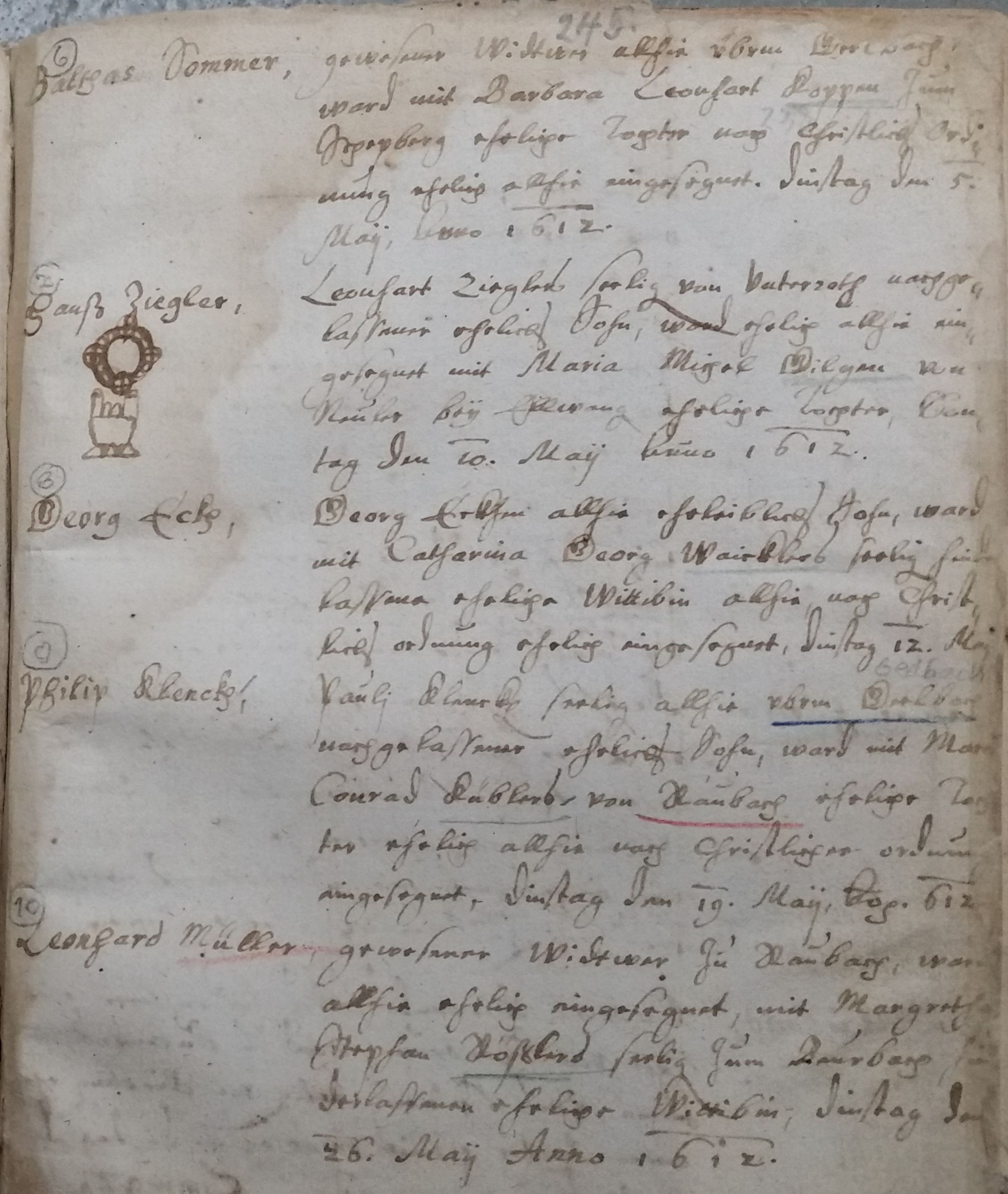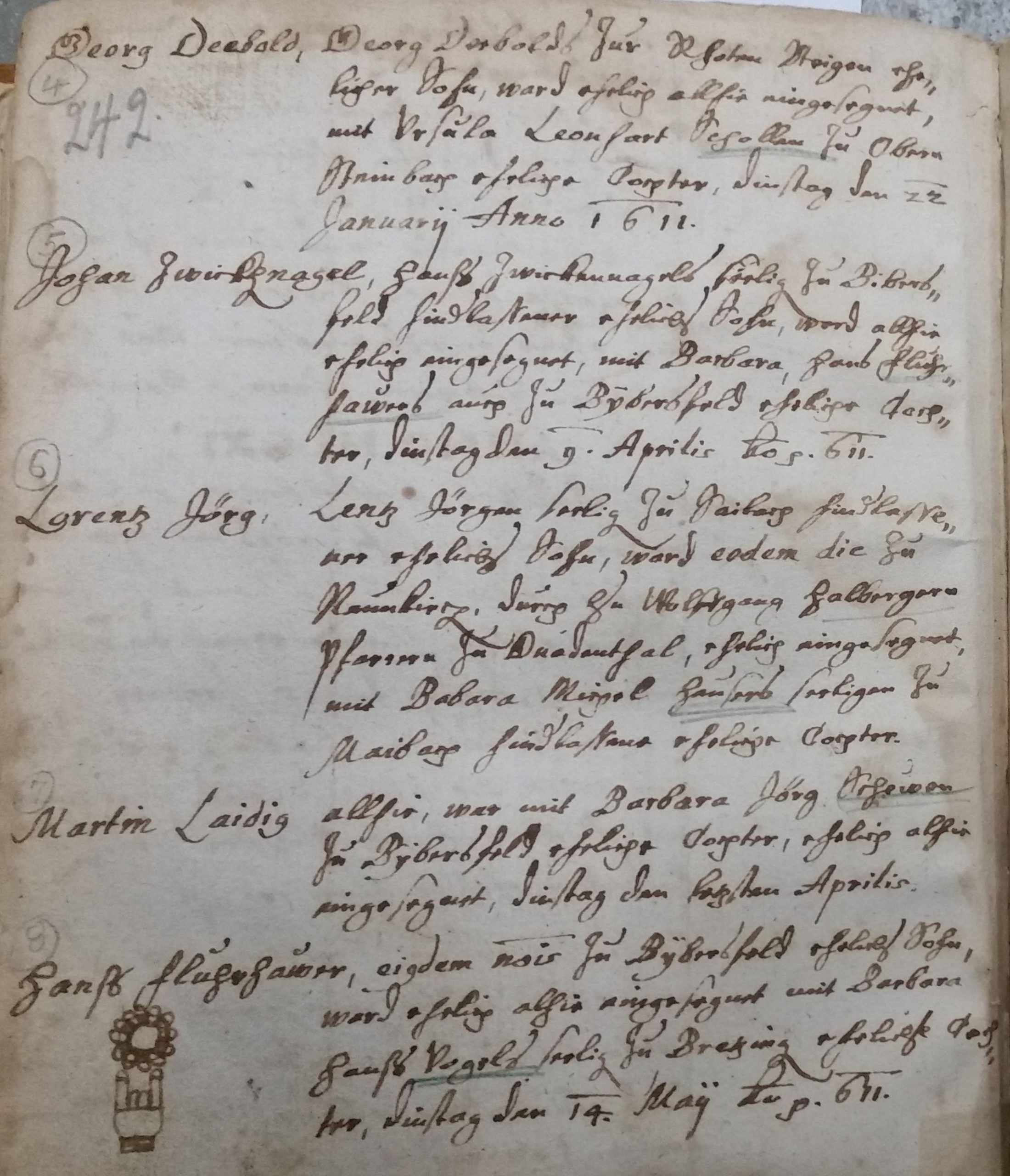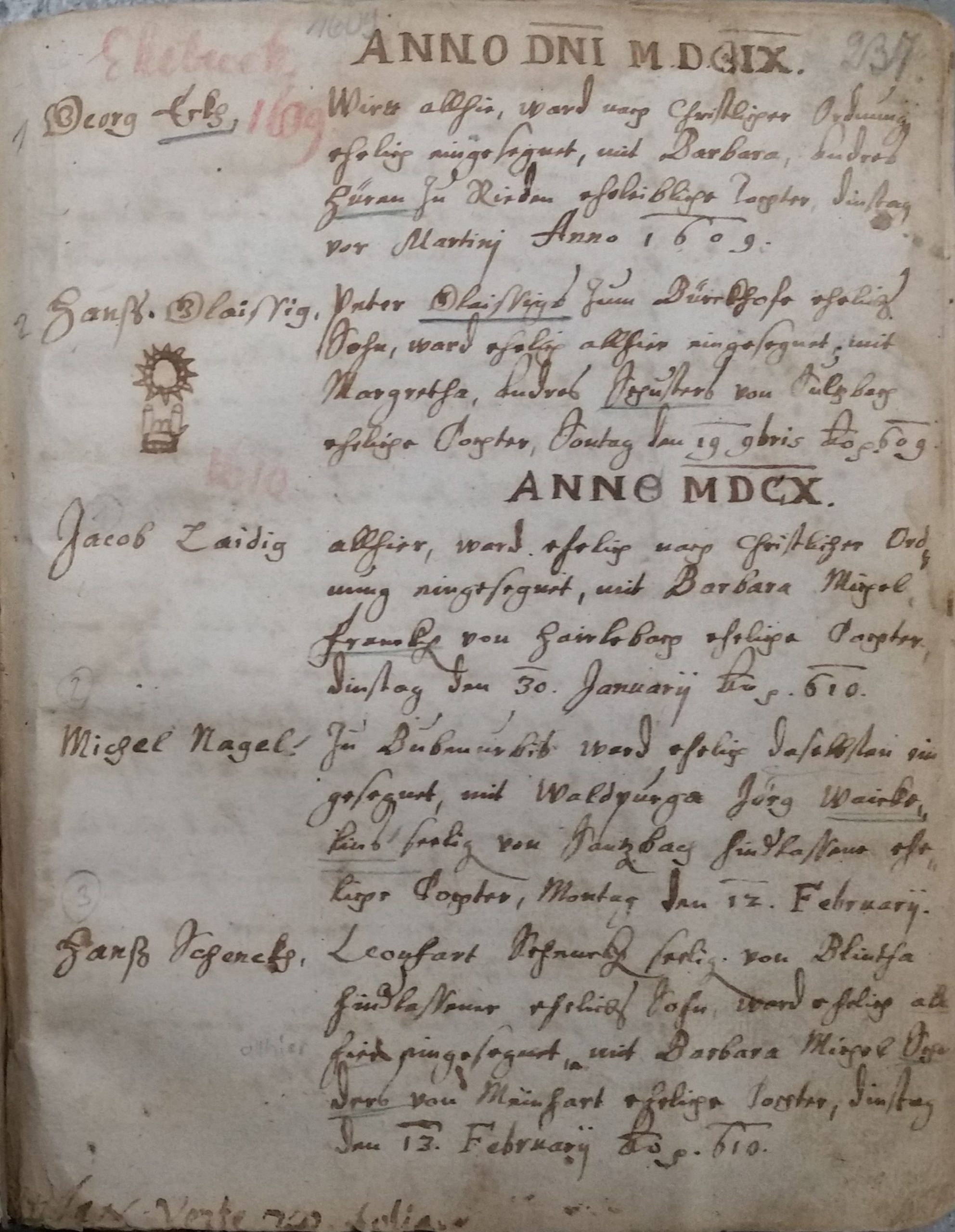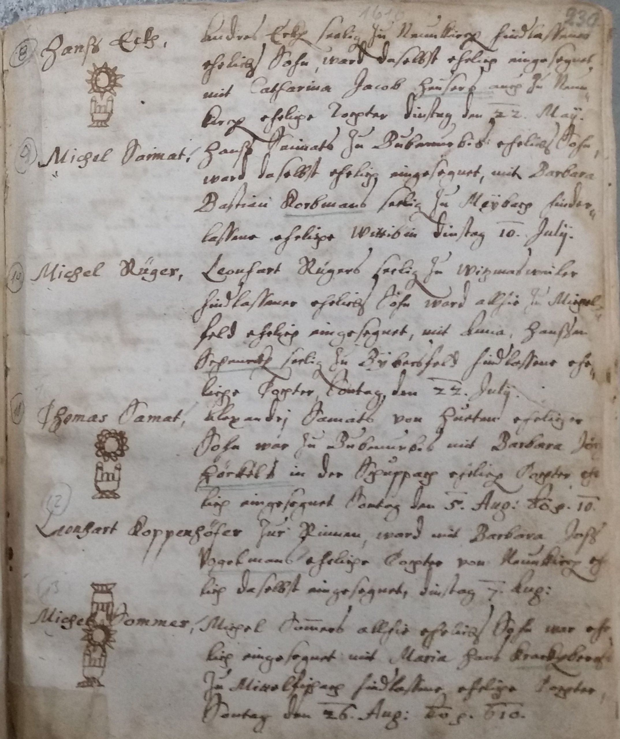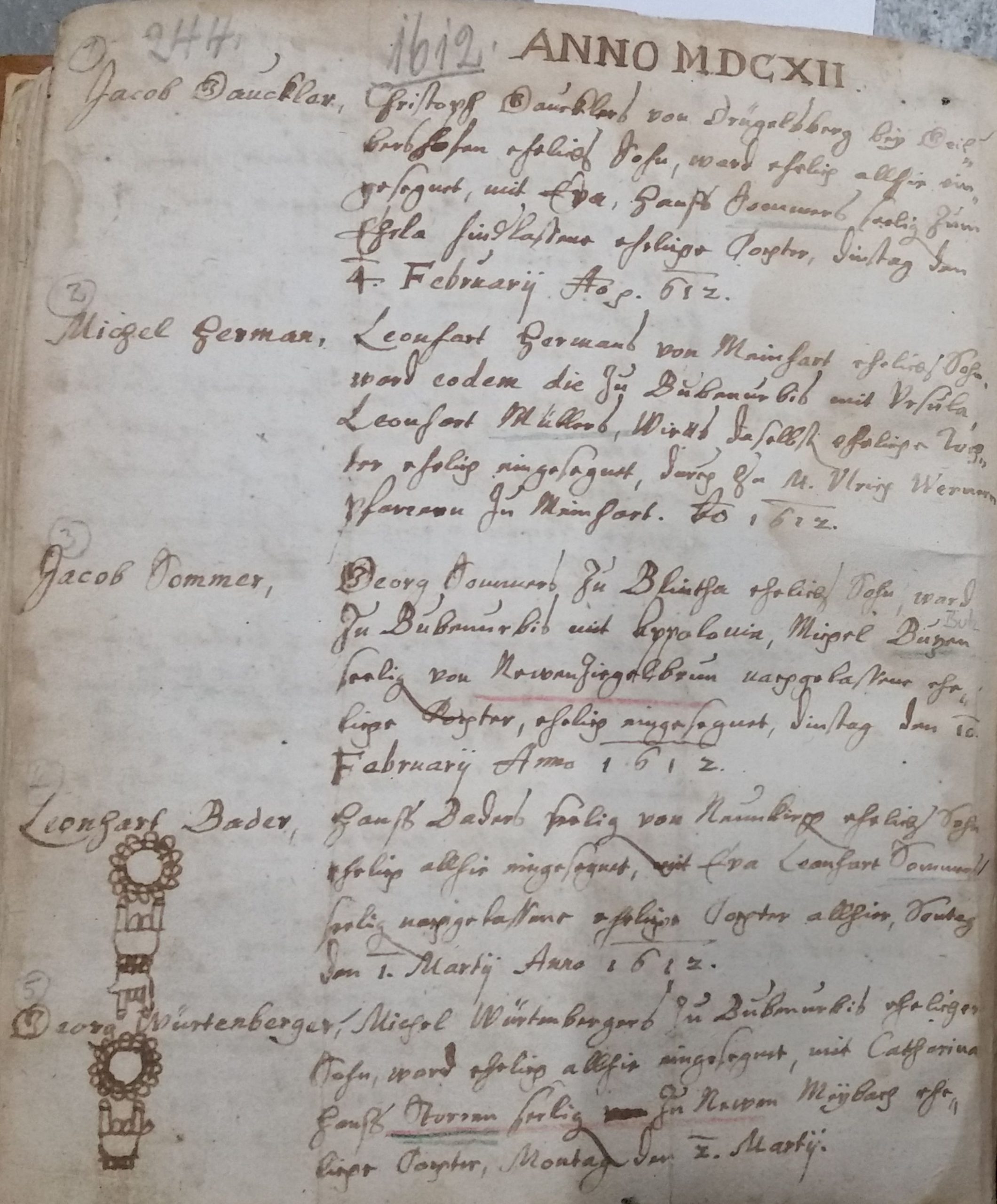 Das eine Ehepaar hatte am 30.01.1610 geheiratet, das andere am 22.07.1610. Ihr erstes Kind wurden am 04.06.1611 bzw. 24.10.1611 getauft, also jeweils mehr als neun Monate nach der Hochzeit.