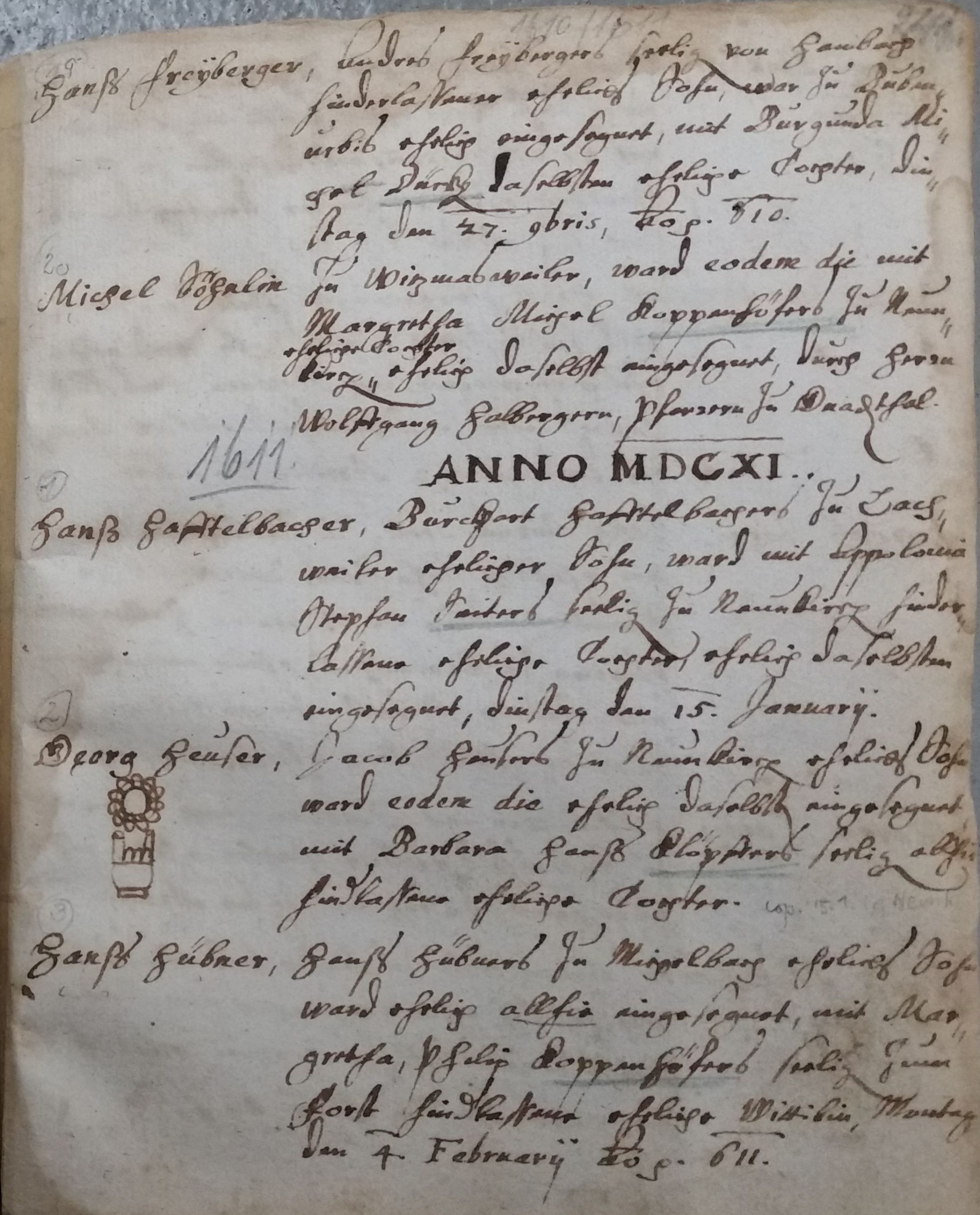 Im Eheregister der Pfarrei Michelfeld (Kirchenbezirk Schwäbisch Hall) sind in den Jahren 1609 bis 1612 neben neun Einträgen Symbole zu finden, die einen Kranz und eine „Gehörnte Hand“ (mano cornuta) darstellen. Den meisten wird die „Gehörnte Hand“ als Metal-Hand („Pommesgabel“) bekannt sein, jedoch hat sie in verschiedenen Zusammenhängen andere Bedeutung. Welche sie und der Kranz im Eheregister haben, wird erkennbar, wenn man im Taufregister nach dem jeweils ersten Kind der betroffenen Ehepaare schaut.