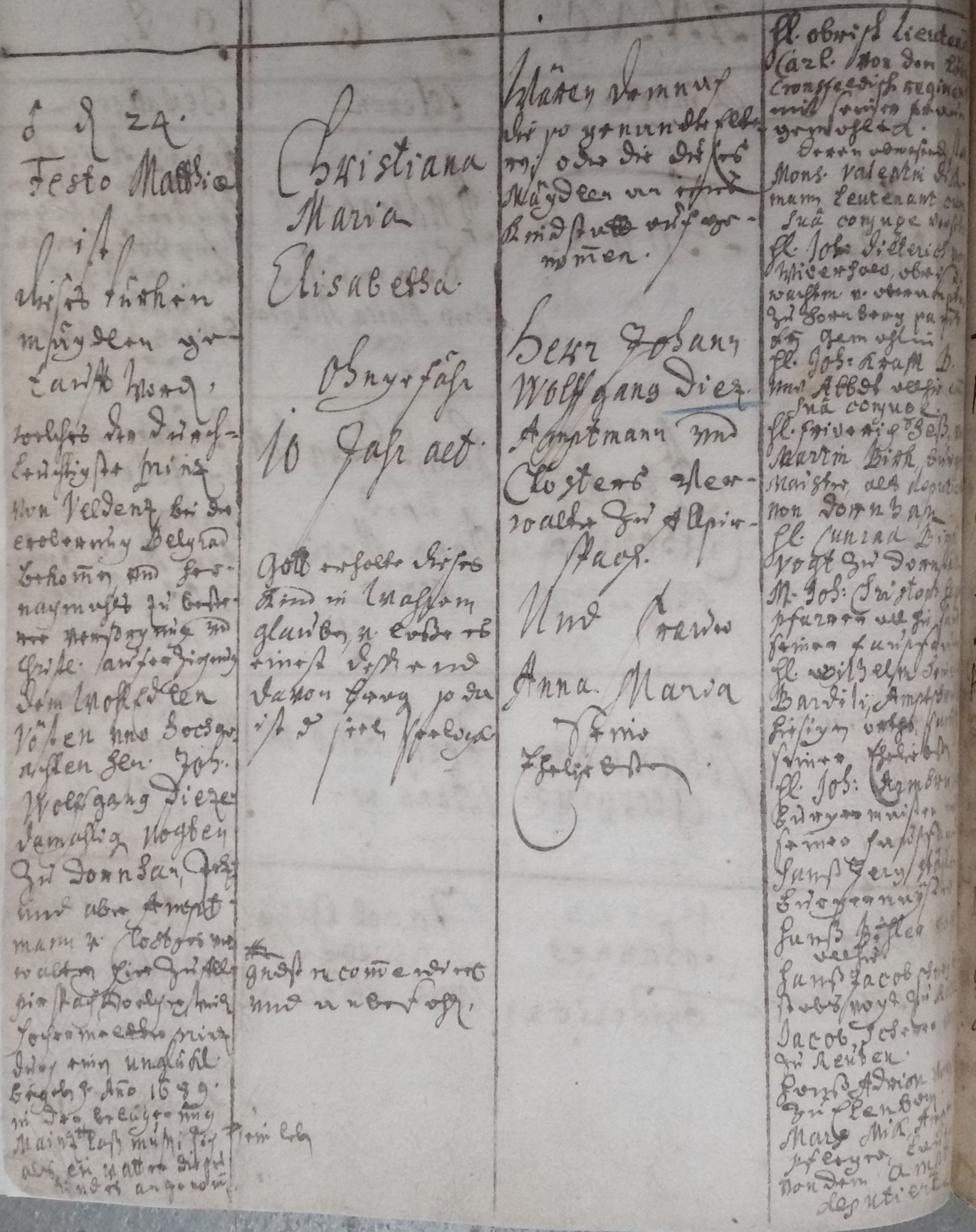 Auffällig im Taufeintrag der Christiana Maria Elisabetha ist die große Zahl der Paten. Diese waren der Obrist-Lieutenant Carl vom Cronsfeldischen Regiment mit seiner Ehefrau, die durch den Leutnant Valentin Dikmann und seiner Ehefrau vertreten wurden, Johann Dieterich Widerholt, Obristwachtmeister und Oberamtmann zu Hornberg, mit seiner Gemahlin, Johann Krafft, der Abt von Alpirsbach und seine Ehefrau, die beiden Bürgermeister Friderich Heß und Martin Birk „als Deputierte von Dornhan“, Cunrad Birk, Vogt zu Dornstetten, Johann Christoph Hegel, Pfarrer in Alpirsbach, mit seiner Gemahlin, Wilhelm Heinrich Bardili, Amtschreiber in Alpirsbach, mit seiner Ehefrau, Johann Armbruster, Bürgermeister in Alpirsbach, mit seiner Ehefrau, Hanß Jerg Stählein, Bürgermeister in Alpirsbach, Hanß Bihler, Vogt zu Alpirsbach, Hanß Jacob Schneider, Stabsvogt zu Rötenbach, Jacob Scherer, Vogt zu Reutin, Hanß Adrion, Vogt zu Ehlenbogen und Marx Mik, Amtspfleger in Alpirsbach, „lauter von dem Ampt deputierte“. Insgesamt sind 21 Paten (und zwei Stellvertreter) genannt, deutlich mehr als bei der Taufe eines leiblichen Kindes von Johann Wolfgang Diez am 2. April 1691. Dort sind es nur vier Paten (und zwei Stellvertreter). Warum genau einige Paten vom Amt abgeordnet worden sind, bleibt offen.