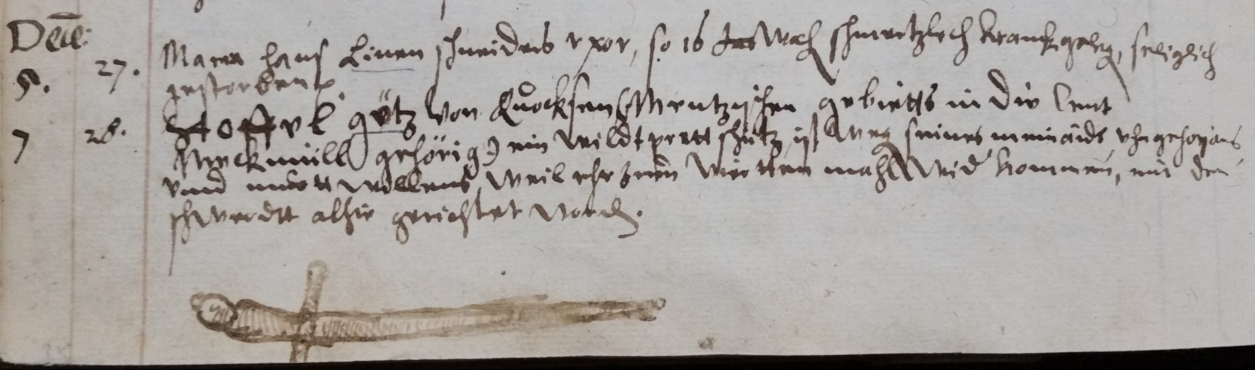 In Neuenstadt am Kocher findet man in zwei Totenregistern mehrere Einträge, die durch Skizzen von Schwert und Rad, eines Schwerts ...