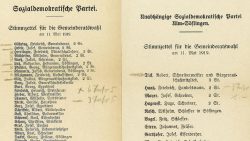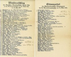 rekonstruieren. Fest steht aber, das man sich Gedanken gemacht hat und offensichtlich ein breites politisches Spektrum als wählbar ansah. Den erhaltenen Notizen zufolge lag die Deutsche Demokratische Partei Ulms bei den Mitarbeitern der Münsterbauhütte hoch im Kurs, gleich 19 Kandidaten sollten drei bis sechs Stimmen bekommen, gefolgt von der Sozialdemokratischen Partei mit zehn Kandidaten und der Zentrumspartei mit neun Kandidaten. Schlusslicht bildeten hier die Württembergische Bürgerpartei mit vier Kandidaten und die Unabhängige Sozialdemokratische Partei Ulm-Söflingen mit nur einem Kandidaten, der drei Stimmen erhalten sollte. Ob tatsächlich so aus der Münsterbauhütte heraus gewählt wurde, bleibt Spekulation.