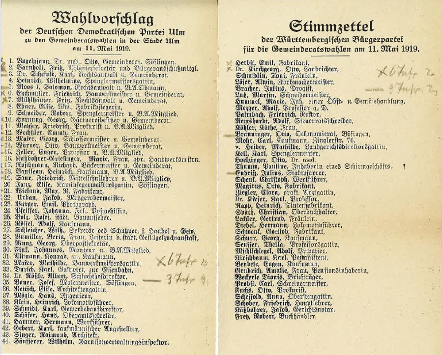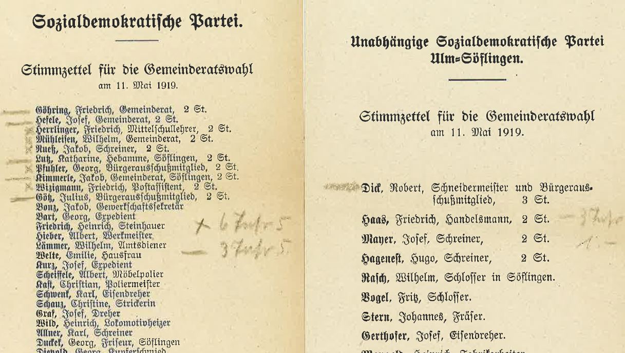 Politik geht vom Volk aus und sein Instrument sind Wahlen. Gerade heute wird dieses Instrument immer wichtiger, wer nicht wählen geht, wählt populistisch. Auch damals war man sich der Bedeutung und der Macht der Wahlen bewusst. Mit Kreuzen und Strichen versehene Stimmzettel der Gemeinderatswahlen in der Stadt Ulm am 11. Mai 1919 aus dem Archiv der Ulmer Münsterbauhütte lassen erahnen, dass Politik im Alltag der Bürger eine Rolle spielte und angekommen war. Ob die Notizen vom Münsterbaumeister oder einer seiner Mitarbeiter stammen, lässt sich heute nicht mehr