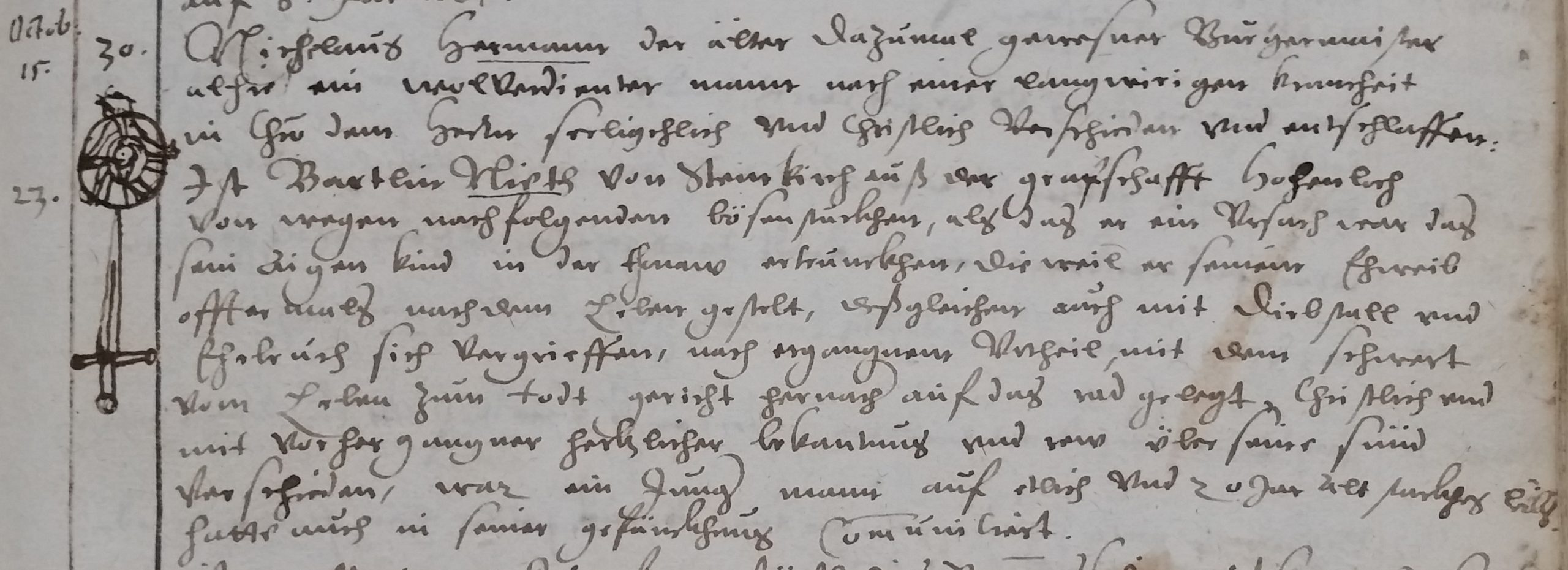 22.10.1602: „Ist Bartlin Wirth von Steinkirch[en] auß der Grafschafft Hohenloch von wegen nachfolgenden bösen Stückhen, als das er ein Ursach war das sein aigen Kind in der […] ertrunckhen, die weil er seinem Eheweib offtermals nach dem Leben gestelt, dißgleichen auch mit Diebstall und Ehebruch sich vergriffen, nach ergangenem Urteil mit dem Schwert vom Leben zum Todt gericht, hernach auf das Rad gelegt, christlich und mit vorhergangener hertzlicher Bekantnus und Reu über seine Sünd verschieden, war ein junger Mann auf etlich und 20 Jar alt, welches […] hatte auch in seiner Gefänckhnus communiciert.“