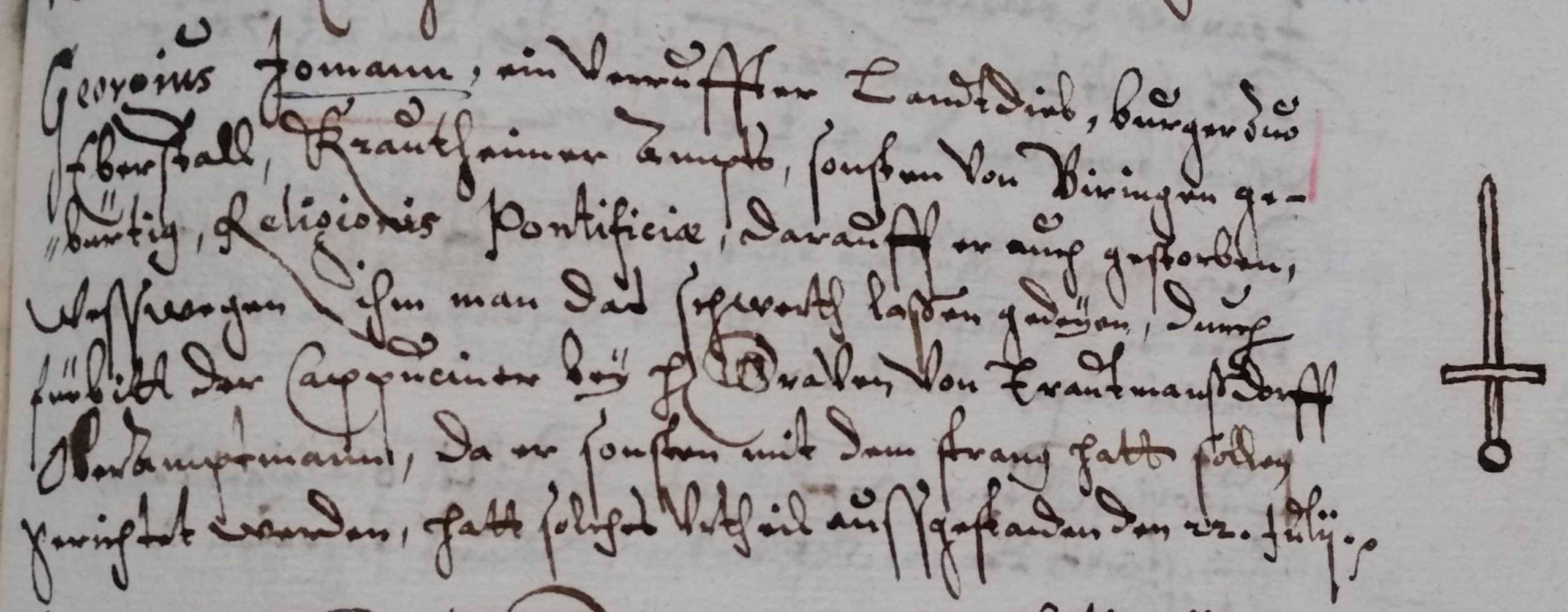 22.07.1639: „Georgius Jomann, ein verruffer Landtdieb, Burger zuo Eberstall, Krautheimer Ampts, sonsten von Biringen gebürtig, Religionis pontificiae, darauff er auch gestorben, wesswegen ihm man das Schwerth laßen gedeyen, durch Fürbitt der Cappuciner bey H[errn] Graven von Trautmansdorff Oberamptmann, da er sonsten mit dem Strang hatt sollen gerichtet werden, hatt solches Urtheil außgestanden den 22. Julii“.