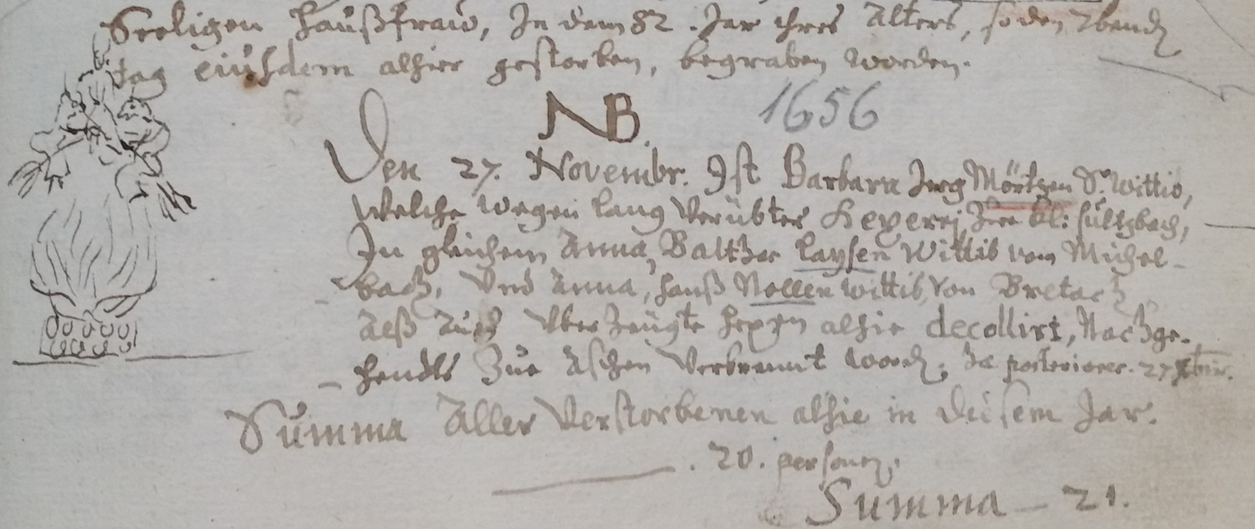 27.11.1656: „Den 27. Novembr[is] ist Barbara, Jerg Mörten s[elig] Wittib, welche wegen lang verübter Hexerei zue Cl[ever]sultzbach, in Gleichem Anna, Balthas Laysen Wittib von Michelbach, und Anna, Hanß Nollen Wittib, von Bretach, alß auch uberzeügte Hexen alhir decolliert [= enthauptet], nachgehendts zue Aschen verbrannt worden.“