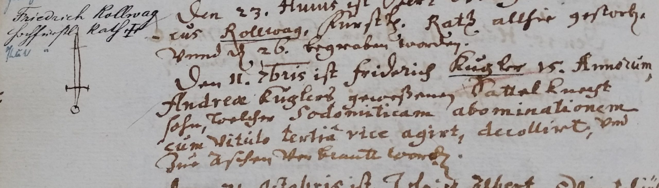 11.09.1666: „Den 11. 7bris ist Fridrich Kugler, 15. Annorum [= Lebensjahr], Andreas Kuglers geweßener Sattelknecht Sohn, welcher sodomiticam abominationem cum vitulo tertia vice agirt [= welcher die Sodomie mit einem Kalb zum dritten Mal begangen hatte], decollirt, und zur Aschen verbrannt worden.“