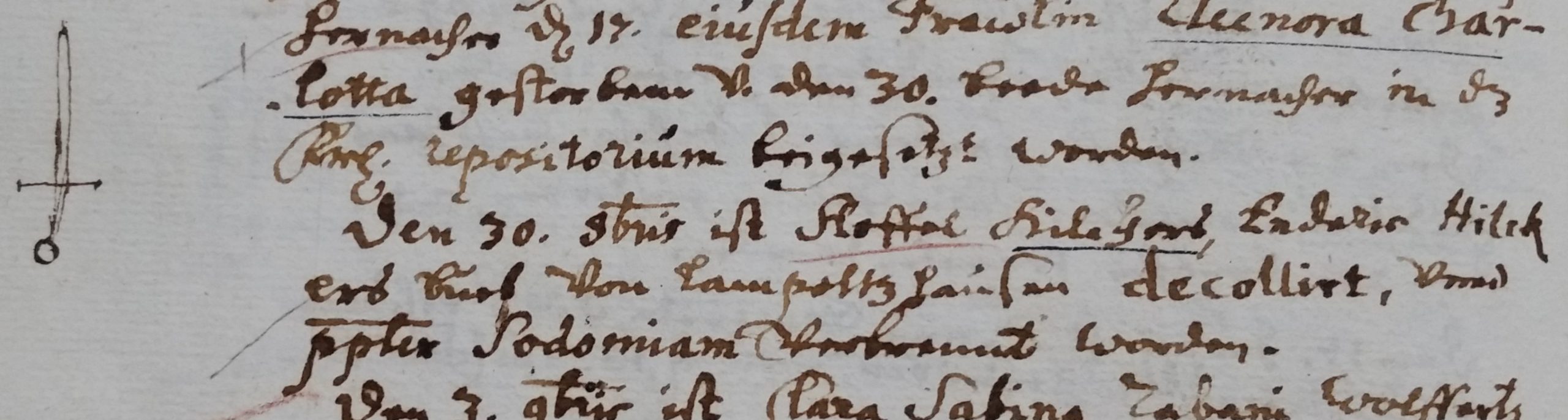 30.10.1666: „Den 30. 8bris ist Stoffel Hilckers, Endris Hilckers Bueb von Lampoltzhausen decollirt und p[er]plex[us] [= verworrener] Sodomiam verbrannt worden.“