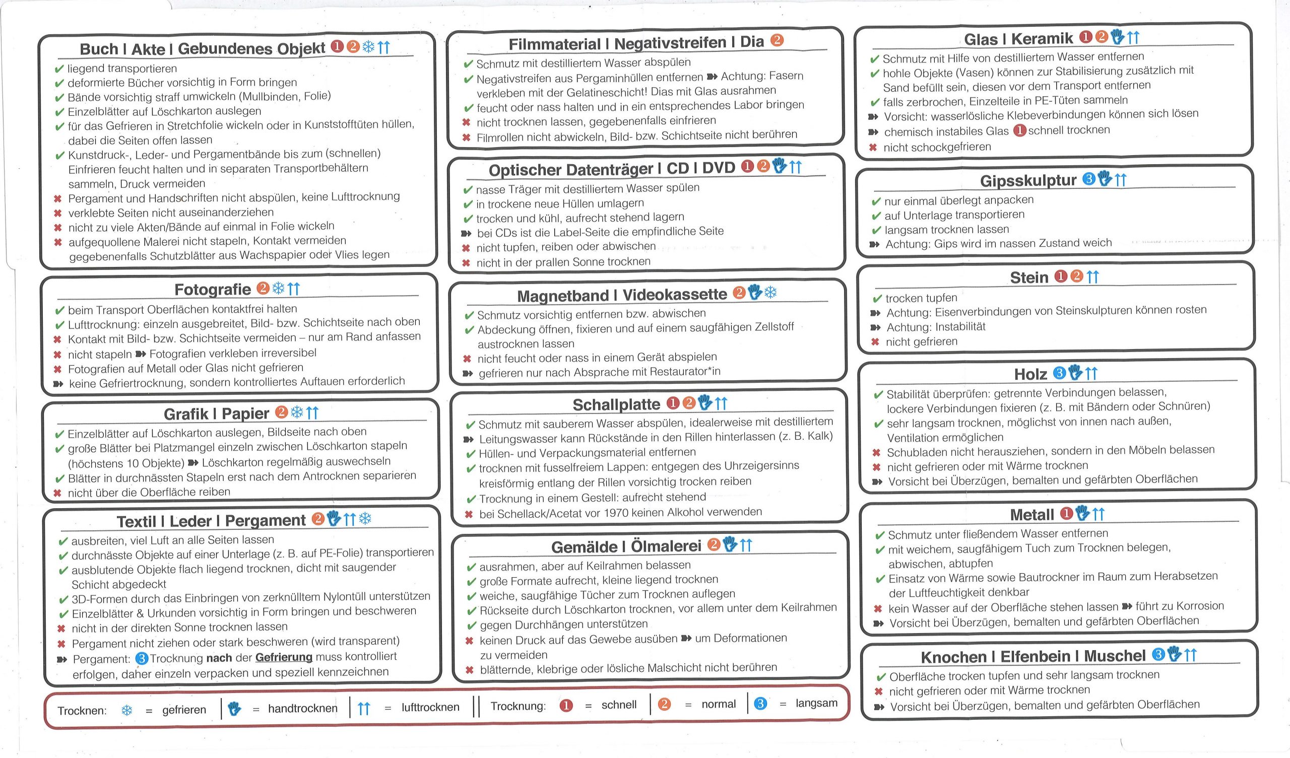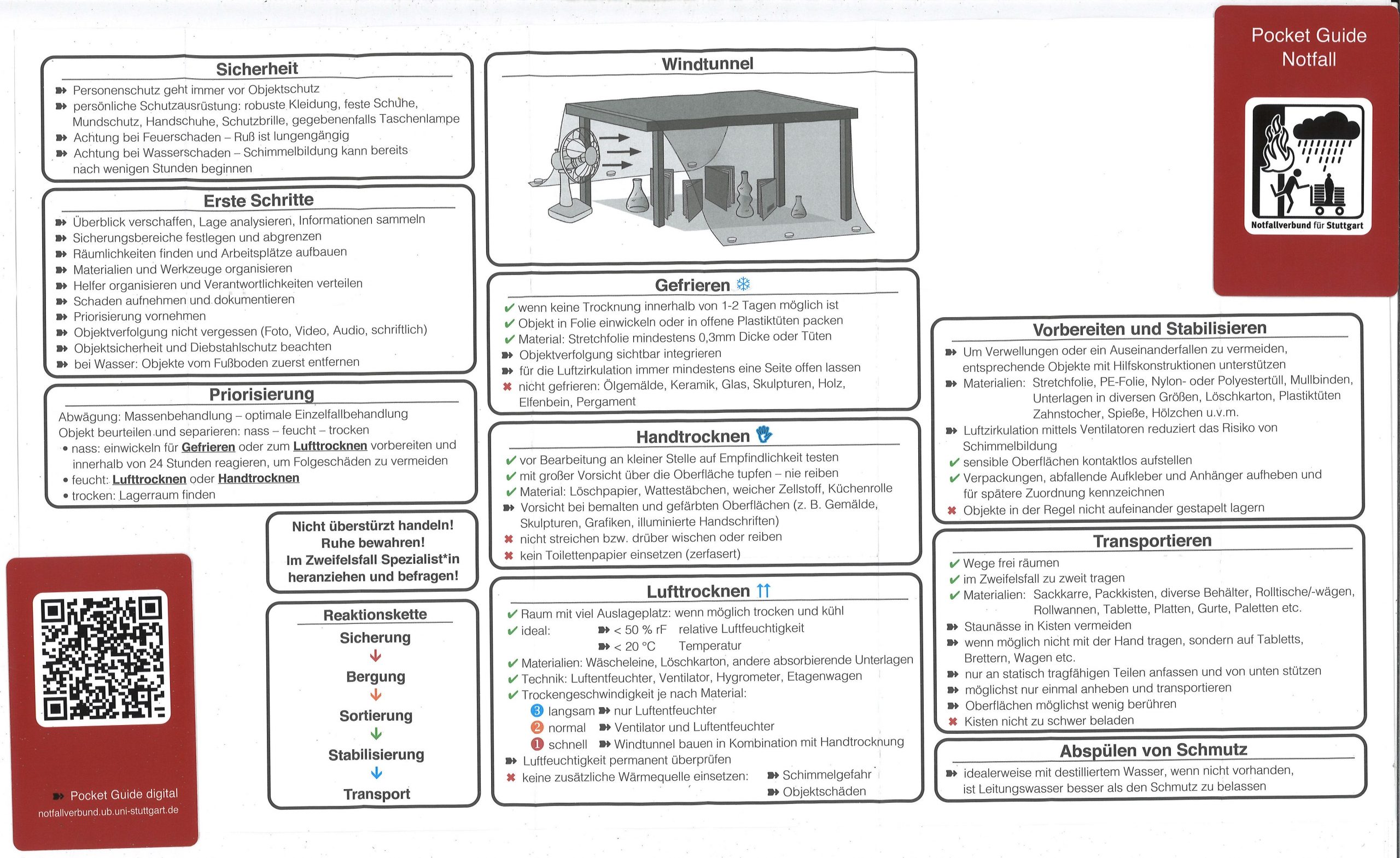 Wenn es im Archiv gebrannt hat oder Wasser im Magazin steht, muss schnell gehandelt werden. Nachdem die Feuerwehr den Brand gelöscht oder das Wasser abgepumpt hat, müssen alle Materialien aus den betroffenen Magazinen geräumt werden. Zu den Sammlungen im landeskirchlichen Archiv und der Landeskirchlichen Zentralbibliothek gehören nicht nur Akten, Bücher, Fotos oder Filme, sondern auch Gemälde, Paramente oder liturgische Geräte. Das bedeutet: im Notfall müssen Objekte aus Papier, Pergament, Leder, Filmmaterial, Glas, Stoff und Metall materialgerecht verpackt, transportiert und ggf. getrocknet werden. Damit in der Aufregung alle Mitarbeiter wissen, wie mit den verschiedenen Objekten umgegangen werden muss, hat der Notfallverbund Stuttgart diesen Quickguide für die Hosentasche erstellt. Wir sind nun vorbereitet – hoffen aber, dass der Notfall nicht eintritt …