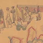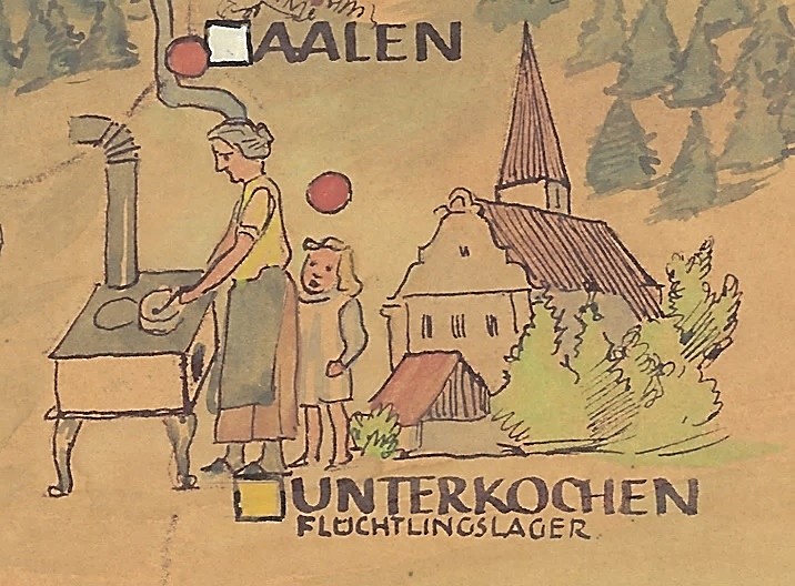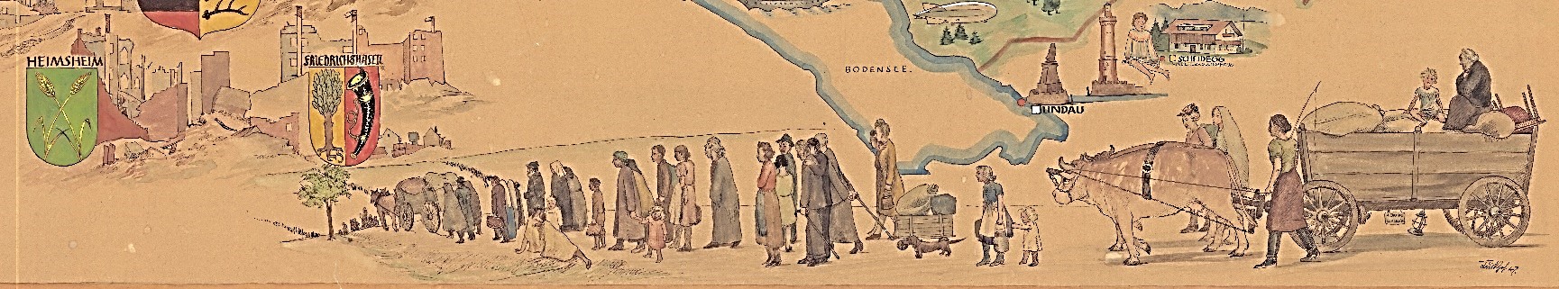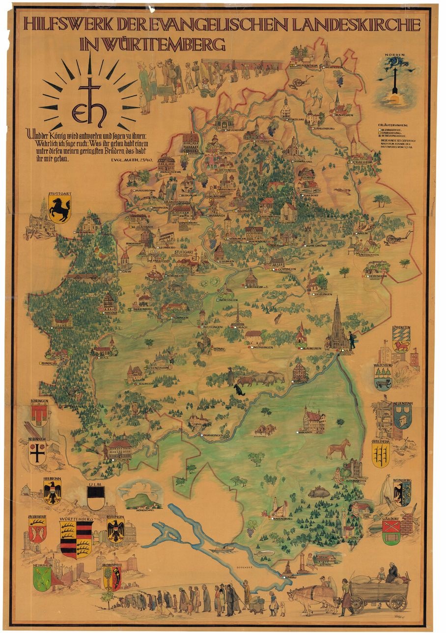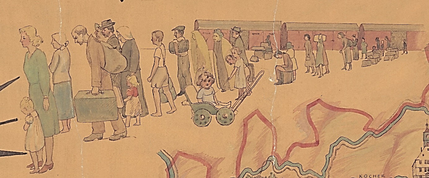 Am oberen und unteren Bildrand sind lange Reihen von Hilfesuchenden dargestellt: Alte, Junge, Versehrte, Kranke, Erschöpfte. Die Menschen oben entsteigen Zugwaggons – offensichtlich auf der Flucht, bepackt mit Bündeln, Koffern und Kisten. Unten kommen sie zu Fuß, schleppen ihr Hab und Gut auf Handkarren oder auf von Ochsengespannen gezogenen Wägen. In diesen Szenen sind all diejenigen dargestellt, an die sich die Arbeit des Hilfswerks richtet. Dazu wird deutlich: Der Arbeitsschwerpunkt lag bei den Millionen von Flüchtlingen und Heimatvertriebenen, die sich nach der Potsdamer Konferenz im Sommer 1945 auf den Weg in den Westen gemacht hatten. Die Probleme der Versorgung und Unterbringung, der Betreuung und Eingliederung – die Leib- und Seelsorge, waren für das Evangelische Hilfswerk in Württemberg eine immense Herausforderung.