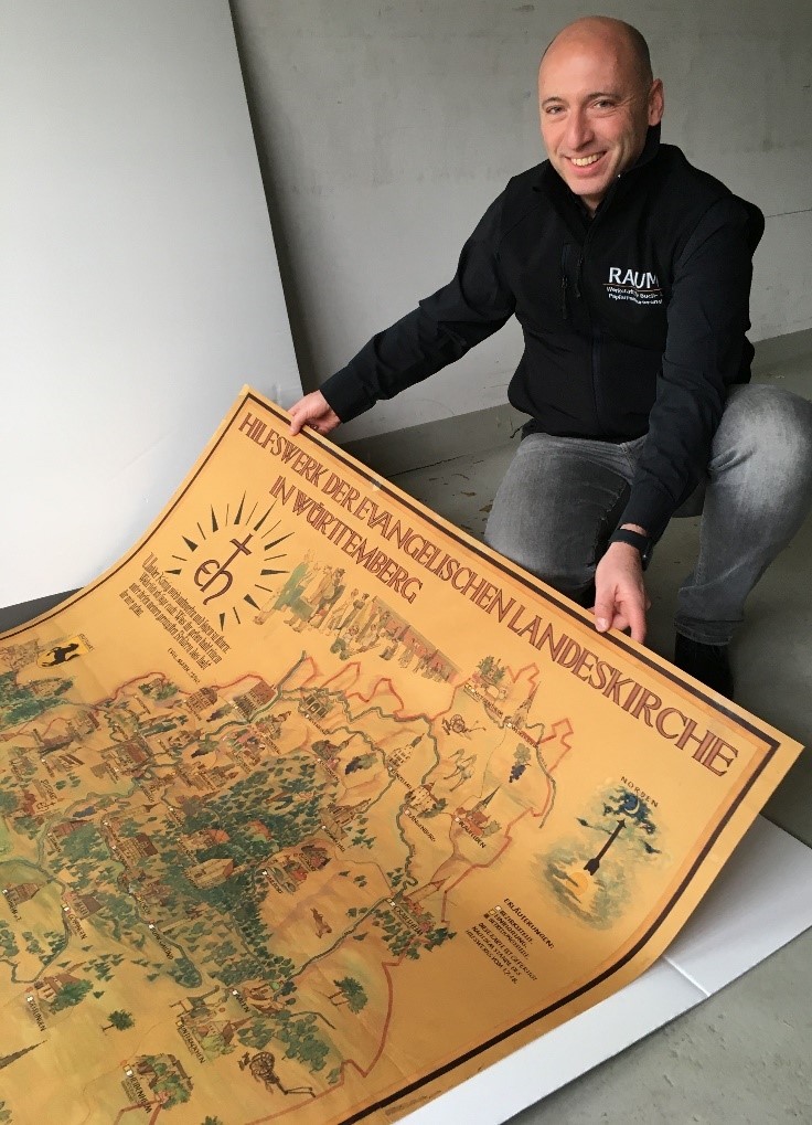 Jahrzehntelange Lagerung hatten dem Objekt zugesetzt. Geknickt, eingerissen und verschmutzt kam es ins Landeskirchliche Archiv Stuttgart zusammen mit den Aktenbeständen des Diakonischen Werks Württemberg. Jetzt wurden die Schäden behutsam repariert und das brüchige Papier entsäuert. Das 197×136 cm große Plakat wird nun unter den klimatisch erforderlichen Bedingungen in unserem Magazin sachgerecht in einem Planschrank aufbewahrt. Das Plakat und seine Darstellungen einzelner Hilfseinrichtungen werden uns bis zum Jahresende bei unserer Serie „Nachkriegszeit“ als roter Faden begleiten.