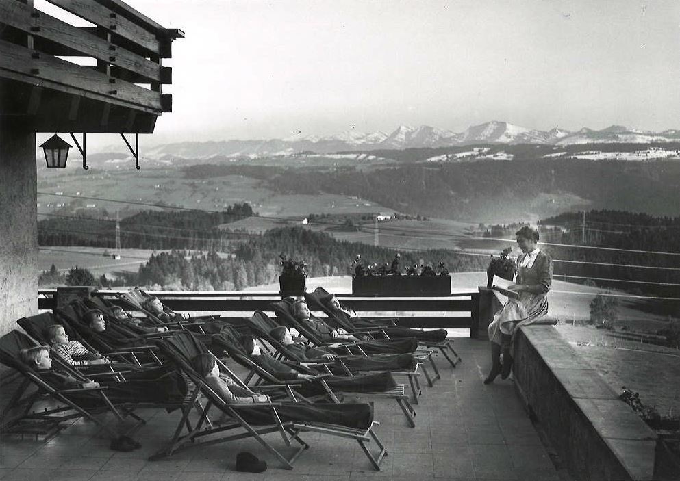 Außenansicht Erholungsheim Bergfreude in Scheidegg. LKAS, Bildersammlung, P 8500 Schlafraum, LKAS, Bildersammlung, P 8517 Nach dem Zweiten Weltkrieg etablierte das ...
