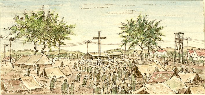Feldgottesdienst im Kriegsgefangenenlager Böckingen. Kolorierte Federzeichnung von Hermann Fuhrmann, 1945 (Quelle: Stadtarchiv Heilbronn)