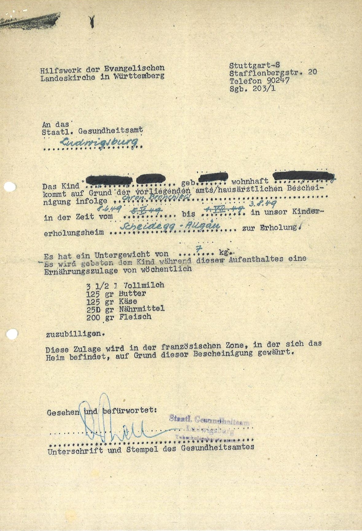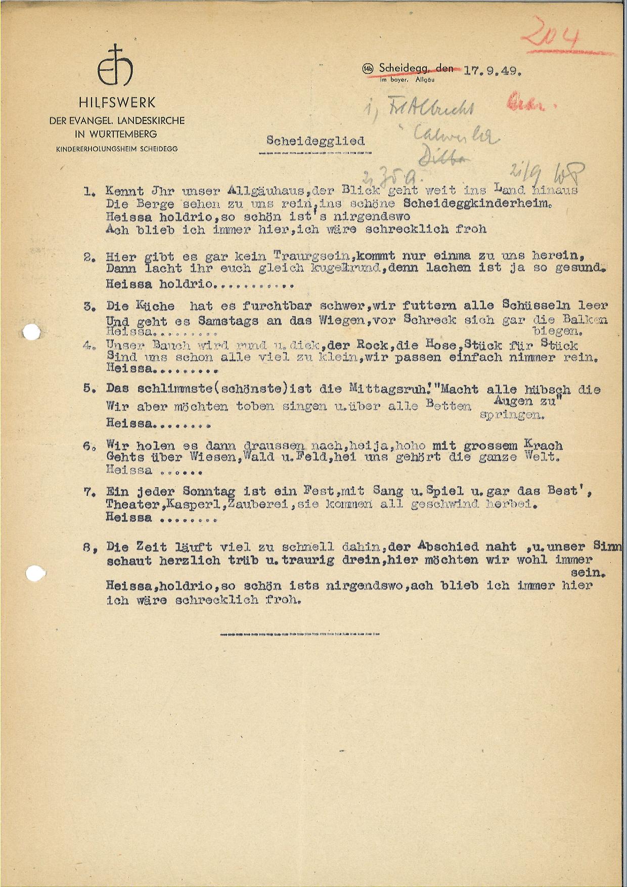 Nach dem Zweiten Weltkrieg etablierte das Evangelische Hilfswerk in Württemberg (die spätere Diakonie) verschiedene Erholungsheime für Kinder, um geschwächten und von Krankheit bedrohten Kindern einen Erholungsaufenthalt zu ermöglichen. Kinder, die als Spätfolgen des Krieges beispielsweise unter nervösen Erschöpfungszuständen, Wachstumsstörungen, Appetitlosigkeit litten oder der Gefahr einer Tuberkuloseerkrankung ausgesetzt waren, wurden über Gesundheits- und Jugendämter in verschiedene Hilfswerk-Erholungsheime vermittelt. So auch nach Scheidegg, denn das Reizklima in den Allgäuer Bergen sollte für asthmatische und Bronchitis anfällige Kinder gesundheitsfördernd wirken. Im Frühjahr 1948 wurde das evangelische Kindererholungsheim „Bergfreude“ eröffnet und sollte den Kindern auch die christliche Botschaft nahebringen. Der Tagesablauf war strukturiert mit Morgenlied, Tischgebet und Abendsegen, sonntags nahmen die Kinder am Kindergottesdienst teil. In den vier- bis achtwöchigen Kuraufenthalten konnten in Scheidegg jeweils 35 Kinder aus meist benachteiligten Familien im Alter von 5-14 Jahren mit „ausgezeichnete[r] Kost, regelmäßige[r] Tageeinteilung, Liegekuren, Spaziergänge[n] in den angrenzenden Wäldern“ (Anm. 1) wieder zu Kräften kommen. Ob den Kindern dieses Programm gefallen hat, lässt sich aus den Akten nicht wirklich entnehmen. Zumindest die Mittagsruhe erfreute sich keiner großen Beliebtheit, wie im „Scheidegger Lied“ (siehe Anhang) zu lesen ist. Angenommen werden kann, dass die individuellen Bedürfnisse des Kindes vermutlich keine große Rolle gespielt haben. Offensichtlich haben sich die Verantwortlichen in der damaligen Zeit wenig Gedanken darüber gemacht, wie ein fünfjähriges Kind vier- bis acht Wochen ohne vertraute Bezugsperson in einer völlig fremden Umgebung zurechtkommen soll. Kinder mussten zu dieser Zeit einfach funktionieren, sich ein- und unterordnen. Trotzdem wurde nach Angaben im „Monatsbrief der Arbeitsgemeinschaft der diakonischen Werke“ darauf geachtet, „daß sich die Kinder während ihres Aufenthalts geborgen fühlen und die Nestwärme kennen lernen, die sie zu Hause oft vermissen.“ (Anm. 2) Sicherlich gab es Kinder, die sich in der Erholungskur wohlgefühlt und das pädagogische Personal als liebevoll erlebt haben. Es kann jedoch angenommen werden, dass manche Kinder vor allem die „gute Ordnung und feste Zucht“ wahrgenommen haben und unangemessen bestraft wurden, wenn sie eingenässt, nicht aufgegessen oder keine Mittagsruhe halten wollten. Für diese Kinder war ein Kuraufenthalt traumatisch und manche leiden noch heute darunter. Erst in den letzten zwei Jahren wurde das Schicksal der „Verschickungskinder“ in den Medien thematisiert. Daher erreichen auch unser Archiv Anfragen Betroffener zu ihrem Aufenthalt in Erholungsheimen. Leider sind nur wenige Sachakten von einigen Erholungsheimen vorhanden, zumeist ohne Namenslisten anhand derer sich rekonstruieren ließe, wer wann in welchem Erholungsheim untergebracht war.