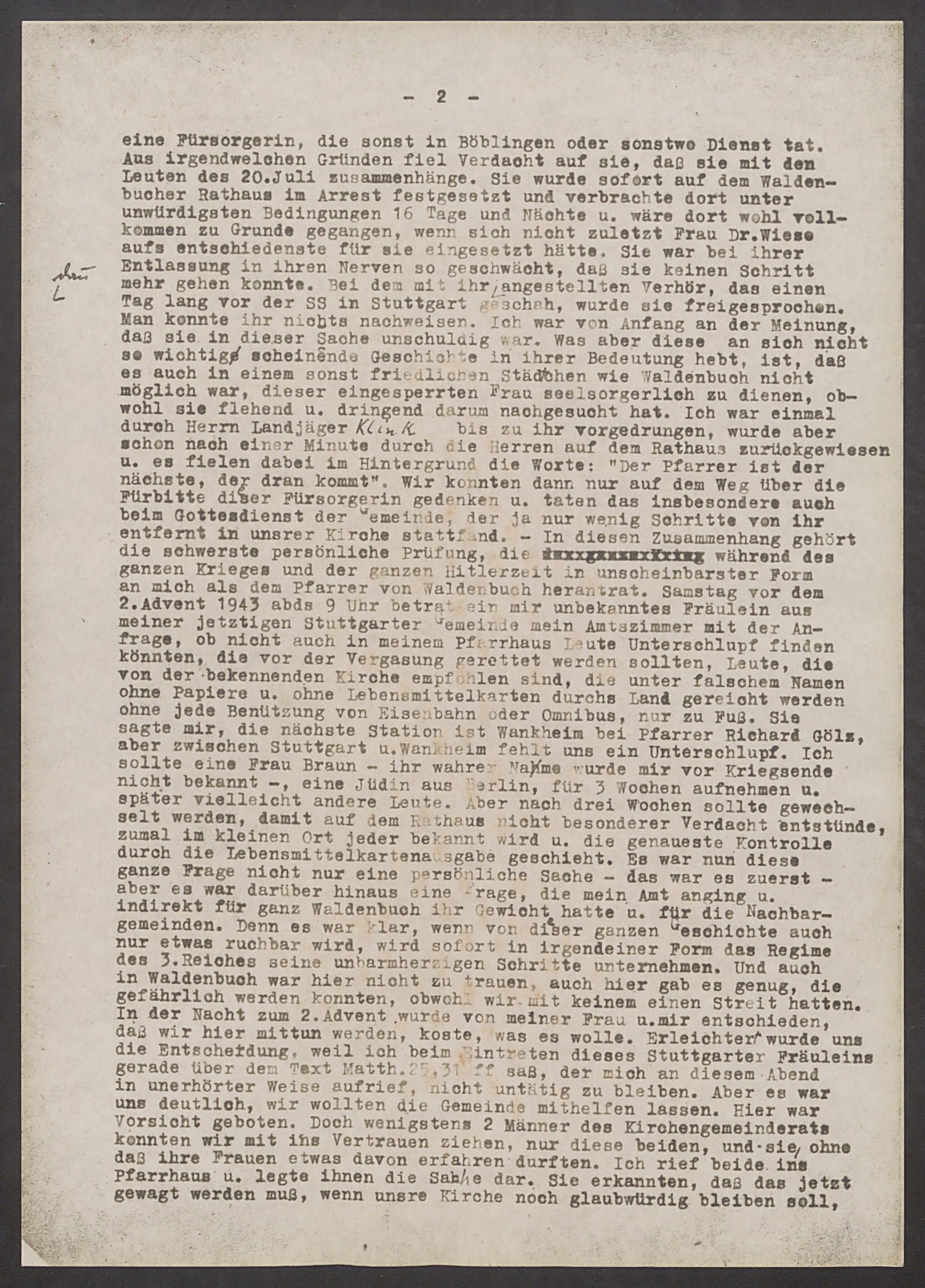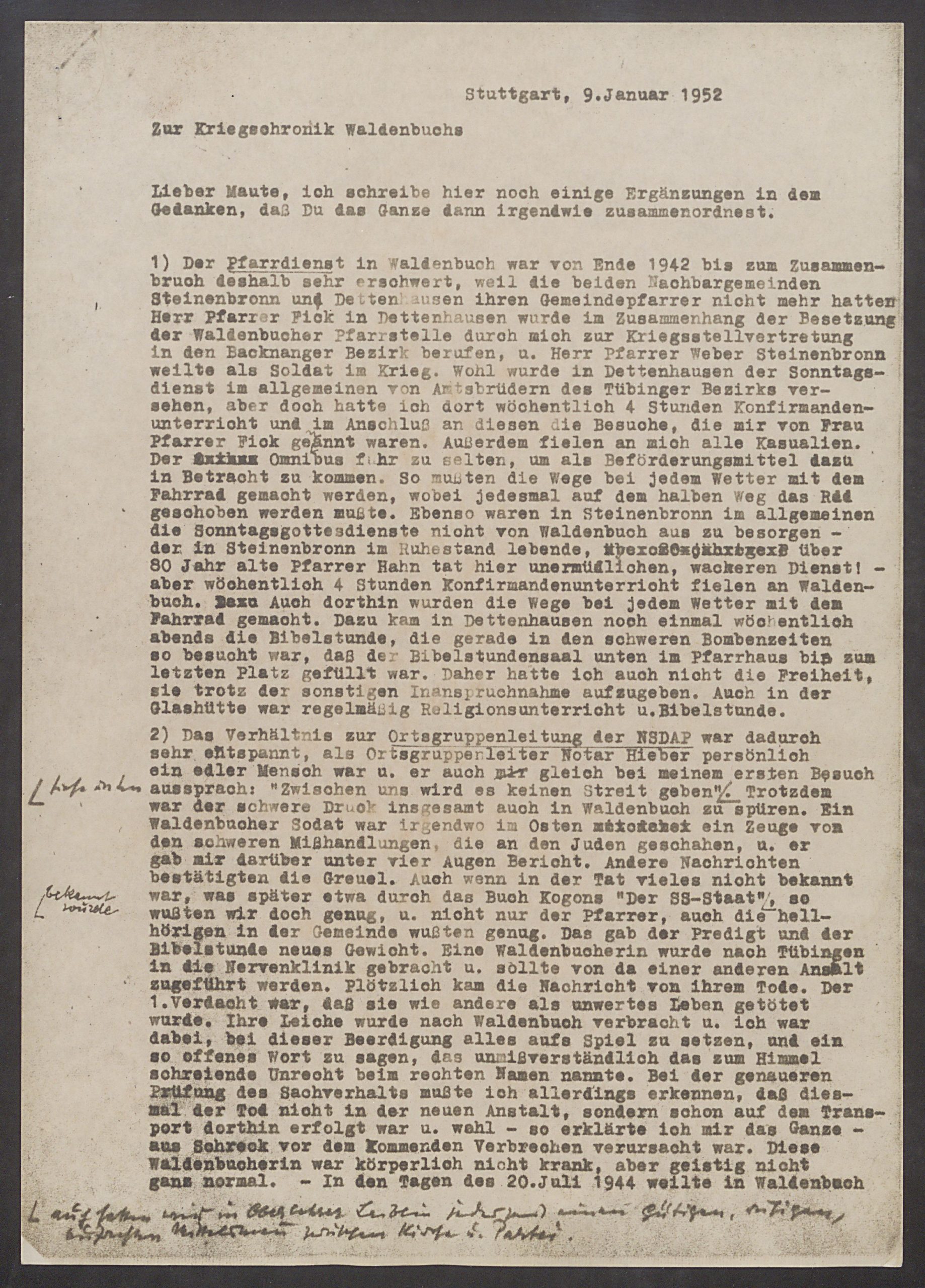 Eine solche Chronik verfasste auch der bereits genannte Waldenbucher Pfarrer Georg Pfäfflin. Pfäfflin, Jahrgang 1908, hatte einige Jahre in der Auslandsgemeinde in Lima/Peru verbracht, bevor er 1943 Pfarrer in Waldenbuch wurde. Er hatte den Kirchenkampf in Waldenbuch nicht miterlebt und erwähnt jene Zeit in seiner Kriegschronik nicht. Sein Bericht aus dem Jahre 1952 weicht vom vorgegebenen Schema ab und konzentriert sich in der Form „einiger Ergänzungen“ auf wenige Aspekte. So ist er einer der wenigen, die klarstellen, dass man um die Verfolgung und Ermordung der Juden wissen konnte: „so wußten wir doch genug, u. nicht nur der Pfarrer, auch die hellhörigen in der Gemeinde wußten genug.“ (hier und im Folgenden LKAS A 126, Nr. 145)
