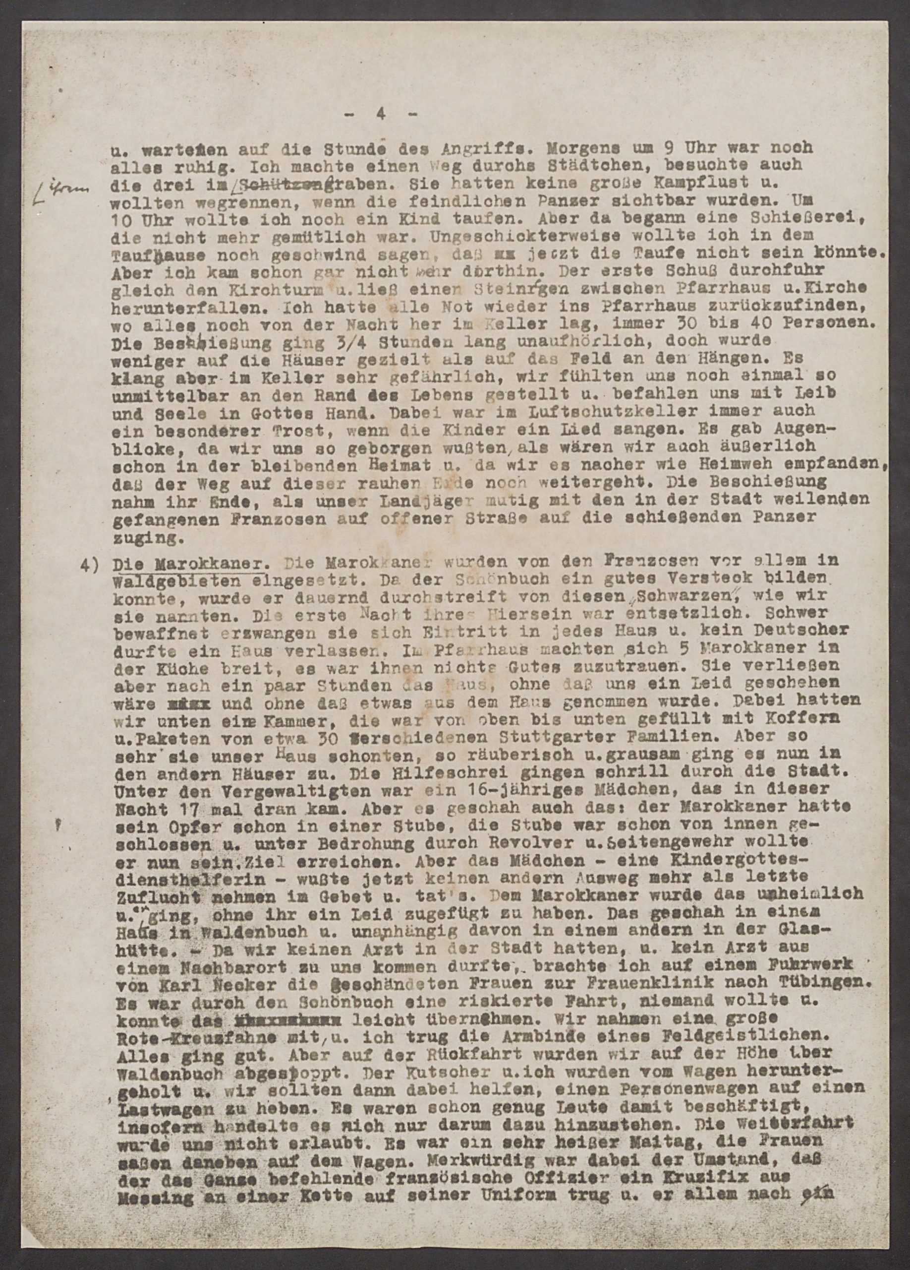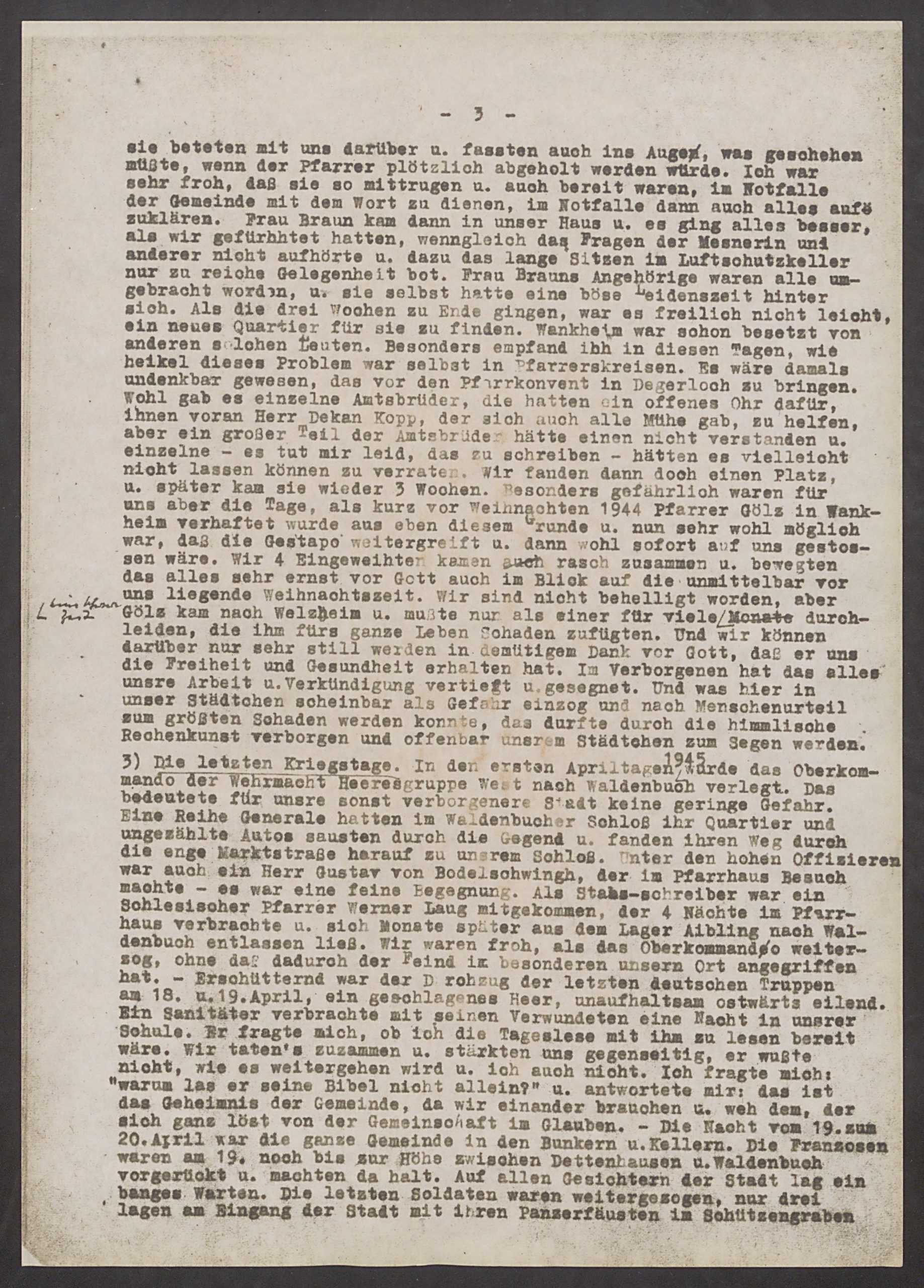 Schon kurz nach Kriegsbeginn 1939 hatte der Evangelische Oberkirchenrat verfügt, dass alle Unterlagen gesammelt werden sollten, die die Rolle der Kirche im Krieg beleuchten könnten. Man stellte sich dabei vor allem vor, es würde um die Beteiligung von Geistlichen oder von Pfarrerssöhnen am Kriegsgeschehen gehen. Spätestens ab 1944 gingen aus allen Ecken der Landeskirche aber ganz andere Berichte ein: In knappen, oft atemlosen Berichten ging es um Fliegerschäden an kirchlichen Gebäuden, um die Einnahme der Orte, um Kampfhandlungen und das Verhalten der Besatzungstruppen, um Plünderungen und Vergewaltigungen, aber auch um Rettung und Bewahrung. In den chaotischen Tagen der unmittelbaren Nachkriegszeit waren die Pfarrämter oft genug das einzig Beständige. Der Waldenbucher Pfarrer Georg Pfäfflin schreibt: „Da plötzlich alle anderen Aemter ausgeschaltet sind, hatte ich für alles zu sorgen.“ (LKAS A 126, Nr. 2716, Qu. 469)