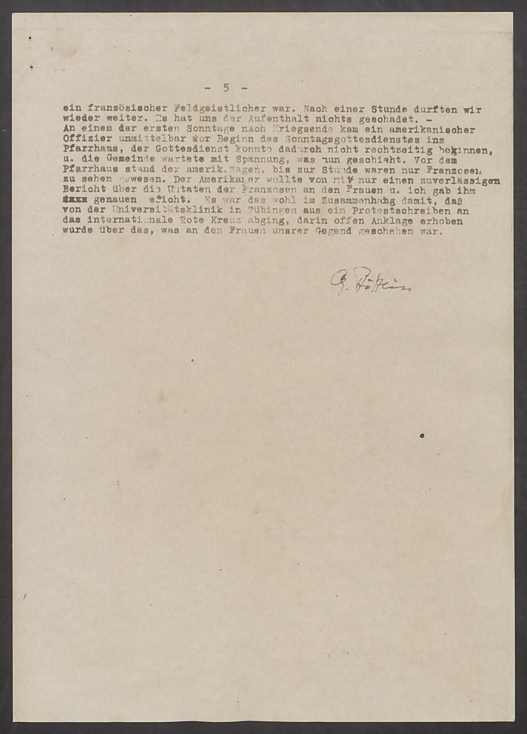 Während Waldenbuch bei der Beschießung und Einnahme des Orts noch verhältnismäßig glimpflich davonkam, litt die Bevölkerung stark unter den ersten Tagen der Besatzung, unter Plünderungen und Vergewaltigungen. Vor allem die oft bei den ersten Truppen eingesetzten marokkanischen Angehörigen der französischen Armee blieben in diesem Kontext im kollektiven Gedächtnis verankert. Oft genug hatte das auch mit einem rassistischen Blick zu tun. Pfäfflins Ton ist ein anderer – er macht sich diesen eklatant rassistischen (und die Realität über die deutschen Truppen verleugnenden) Blick so nicht zu eigen. Dennoch schildert er die Situation in den ersten Besatzungstagen drastisch: „Aber so sehr sie unser Haus schonten, so räuberisch u. grausam ging es nun in den andern Häuser[n] zu. Die Hilfeschrei[e] gingen schrill durch die Stadt.“ Ein 16-jähriges Mädchen wurde 17 Mal vergewaltigt. Zwei andere Vergewaltigungen seien abgebrochen worden, als die Opfer anfingen zu beten. Auch hier bewies sich Pfäfflin als zupackend und brachte die vergewaltigten Frauen mit einem Fuhrwerk in die Tübinger Frauenklinik. Vor dem Hintergrund dieser Erlebnisse wurde die Übernahme der Besetzung durch die amerikanische Armee in Waldenbuch mit Erleichterung aufgenommen.