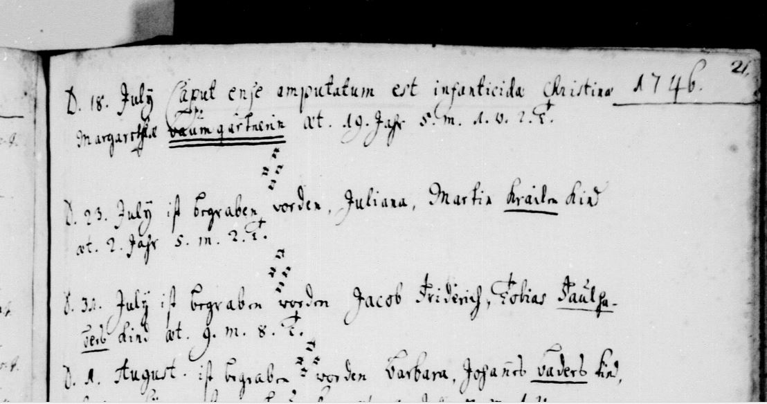 Im Sterberegister von Mühlhausen an der Enz findet sich unter dem Datum 18. Juli 1746 als Todeseintrag für Christina Margaretha ...