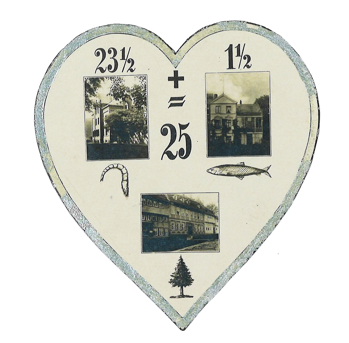 Im Archiv finden sich immer wieder rätselhafte Dinge, deren Bedeutung sich nicht auf Anhieb erschließen lässt. So wie dieses nur 9 x 8 cm große Herz aus dem Nachlass einer Pfarrfamilie, das mit seinen Zahlen, Bildern und Symbolen etliche Fragen aufwirft: Handelt es sich um die Gabe zu einer silbernen Hochzeit, da dieses Herz mit silberner Folie umrahmt ist? Was bedeuten die Jahresangaben in Verbindung mit Ansichten von Gebäuden? Stellen sie etwa die Lebensstationen und Wohnhäuser einer Familie dar, die 23 ½ Jahre in einem Gebäude lebte, dann umzog und dort 1 ½ Jahre lebte und nach 25 Jahren Ehe wiederum ein neues Heim bezog? Unter den jeweiligen Gebäudeansichten sind Garnele, Fisch und Tannenbaum abgebildet. Tanne und Garnele gelten als Fruchtbarkeitsymbole, der Fisch als Symbol der Taufe. Leider finden sich keinerlei Erklärungen zu diesem Fundstück, so dass ein weiter Raum für Spekulationen bleibt.