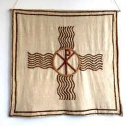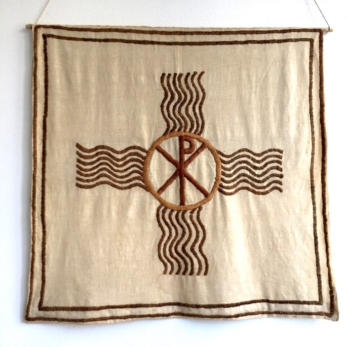 Mitgebracht hatte ihn der württembergische Pfarrer Karl Knoch (1894-1976), der bis Ende 1945 Kriegsgefangener im OFLAG 163 in Larzac/Frankreich war. Dort als Lagerpfarrer eingesetzt, musste er erst einmal die gottesdienstliche Ausstattung beschaffen. Für die Gestaltung des Altartuchs skizzierte Karl Knoch kurzerhand Wasser in Kreuzform und das Christusmonogramm – Symbole für Taufe, Tod und Auferstehung. Der Jugendherbergsschlafsack fand sich als Tuch, die Reste eines aufgelösten Bodenteppichs wurden als Stickgarn requiriert. Für die Ausführung der Stickerei konnte er einen ehemaligen Marinearzt gewinnen, der in Kriegszeiten sicher schon manchen Verletzten zusammengeflickt hatte.