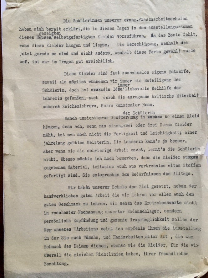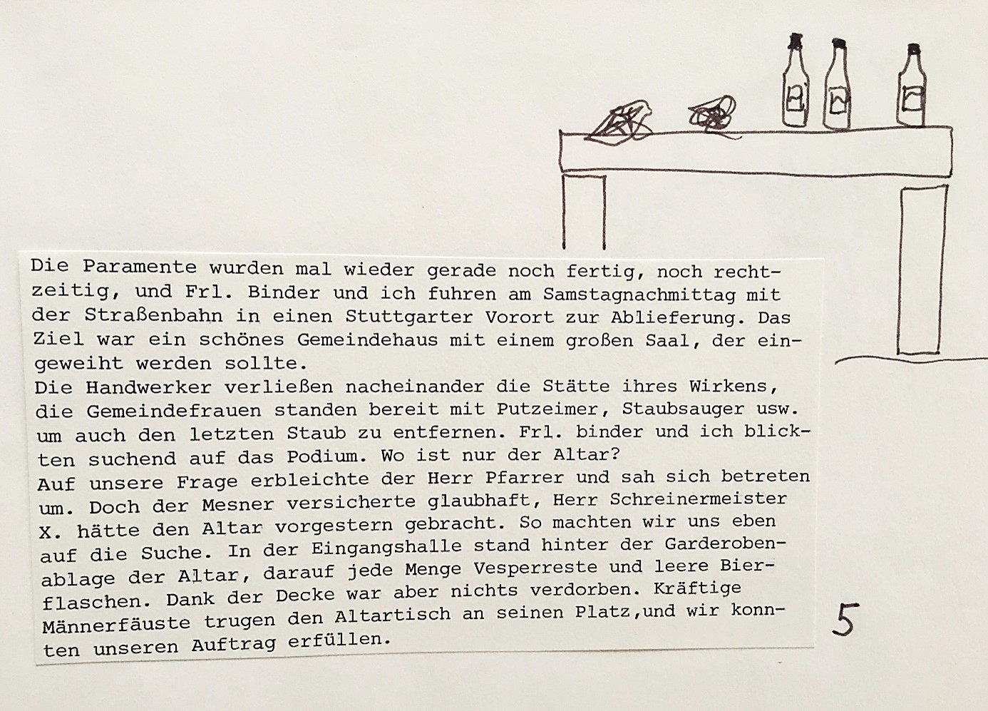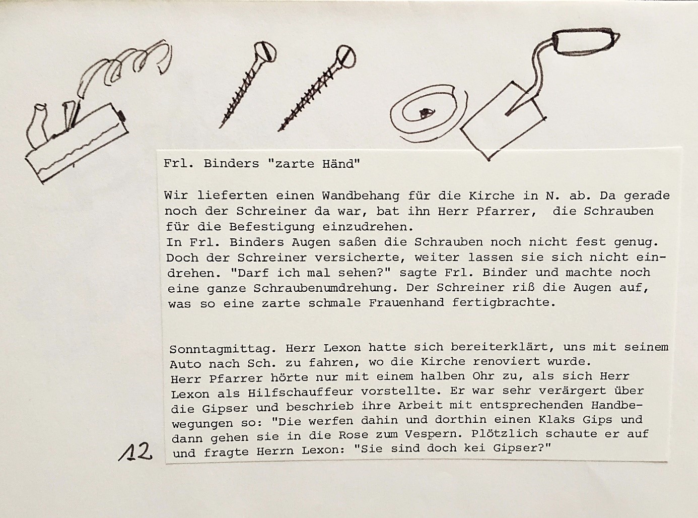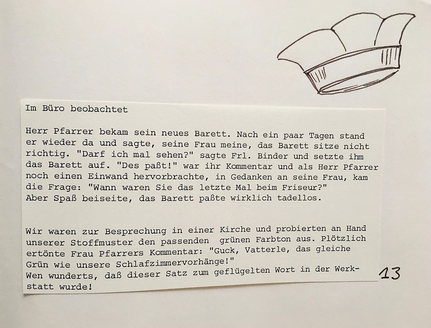 - „Lustiges und Bedenkliches“ aus dem Arbeitsalltag der Paramentenwerkstatt. Erinnerungen der Nachfolgerin Johanna Binders, Erna Schlotterbeck, aufgezeichnet 1985.