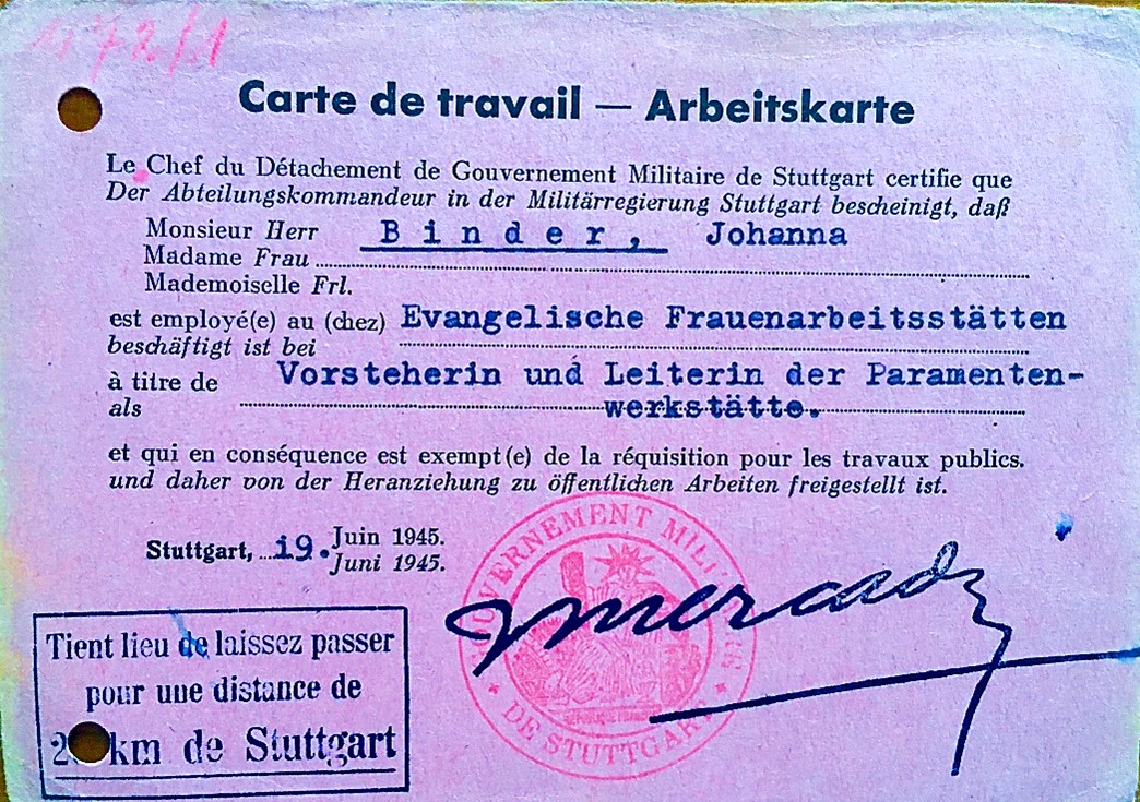 - Johanna Binders Arbeitskarte der Militärregierung, Juni 1945