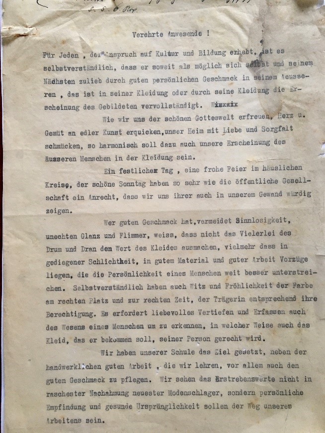 Bis in die 1930er Jahre war der Schule eine „Werkstätte für künstlerische Frauenkleidung“ angegliedert, wo individuelle und zeitgemäße Kleidung entworfen und gefertigt wurde. In Vorträgen, Zeitungsartikeln und Rundfunkbeiträgen klärte Johanna Binder unermüdlich Frauen über körperfreundliche Bekleidung, gut durchlüftete Leibwäsche oder die Schäden enger Strumpfbänder auf und referierte über Stilfragen: „Wer guten Geschmack hat, vermeidet Sinnlosigkeit, unechten Glanz und Flimmer“. Sie war überzeugt, „dass in gediegener Schlichtheit, in gutem Material und guter Arbeit Vorzüge liegen, die die Persönlichkeit eines Menschen weit besser unterstreichen.“ (Vortragstyposkript 1931)