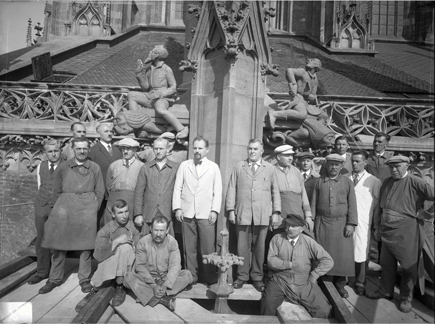- Arbeiter auf dem Dach. Ulm Münsterbauhütte, Bildarchiv