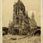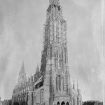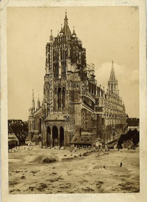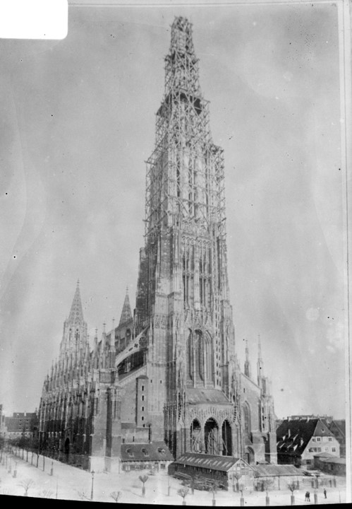 - Blick auf das Münster während des Turmausbaus. Ulm Münsterbahütte, Bildarchiv.