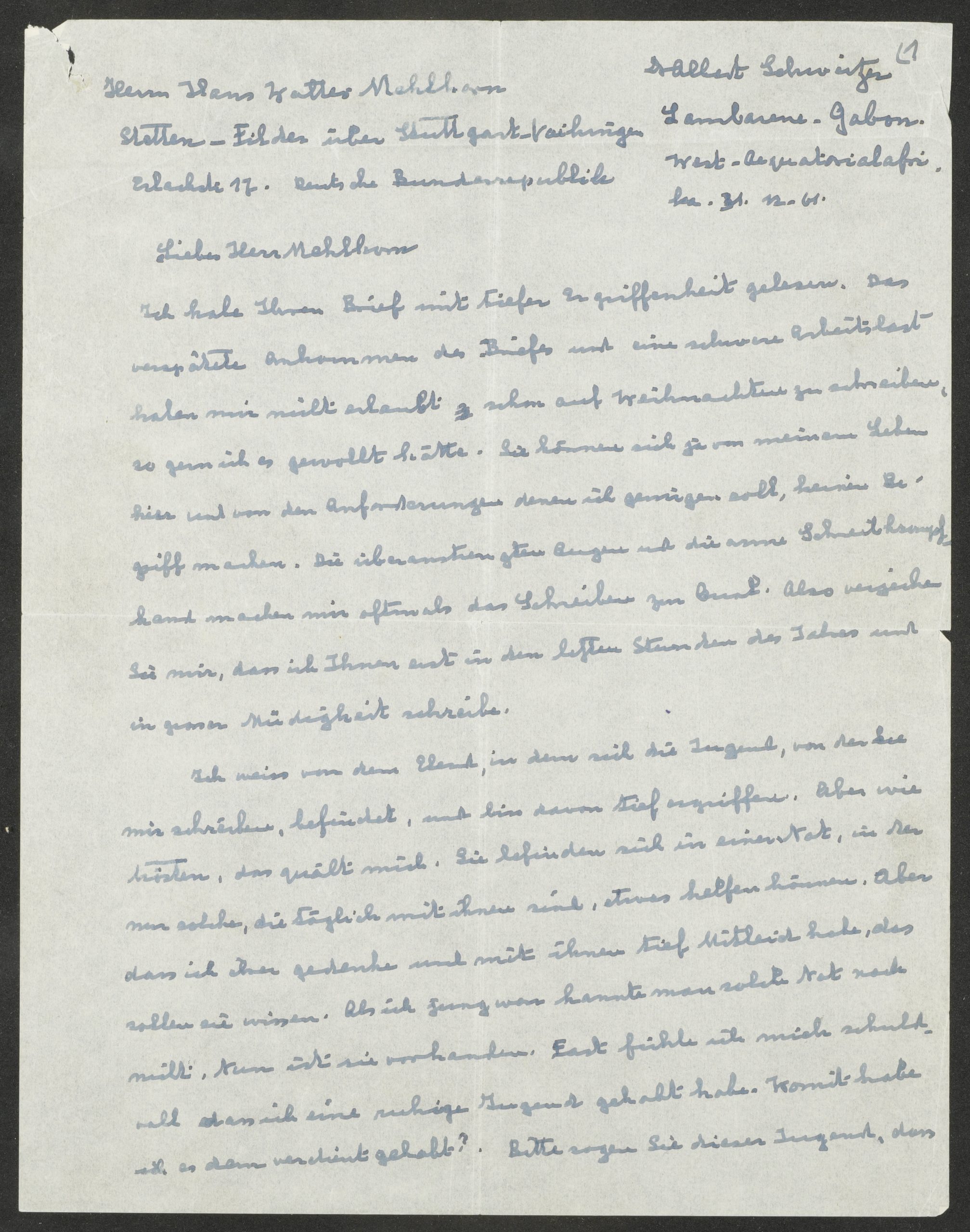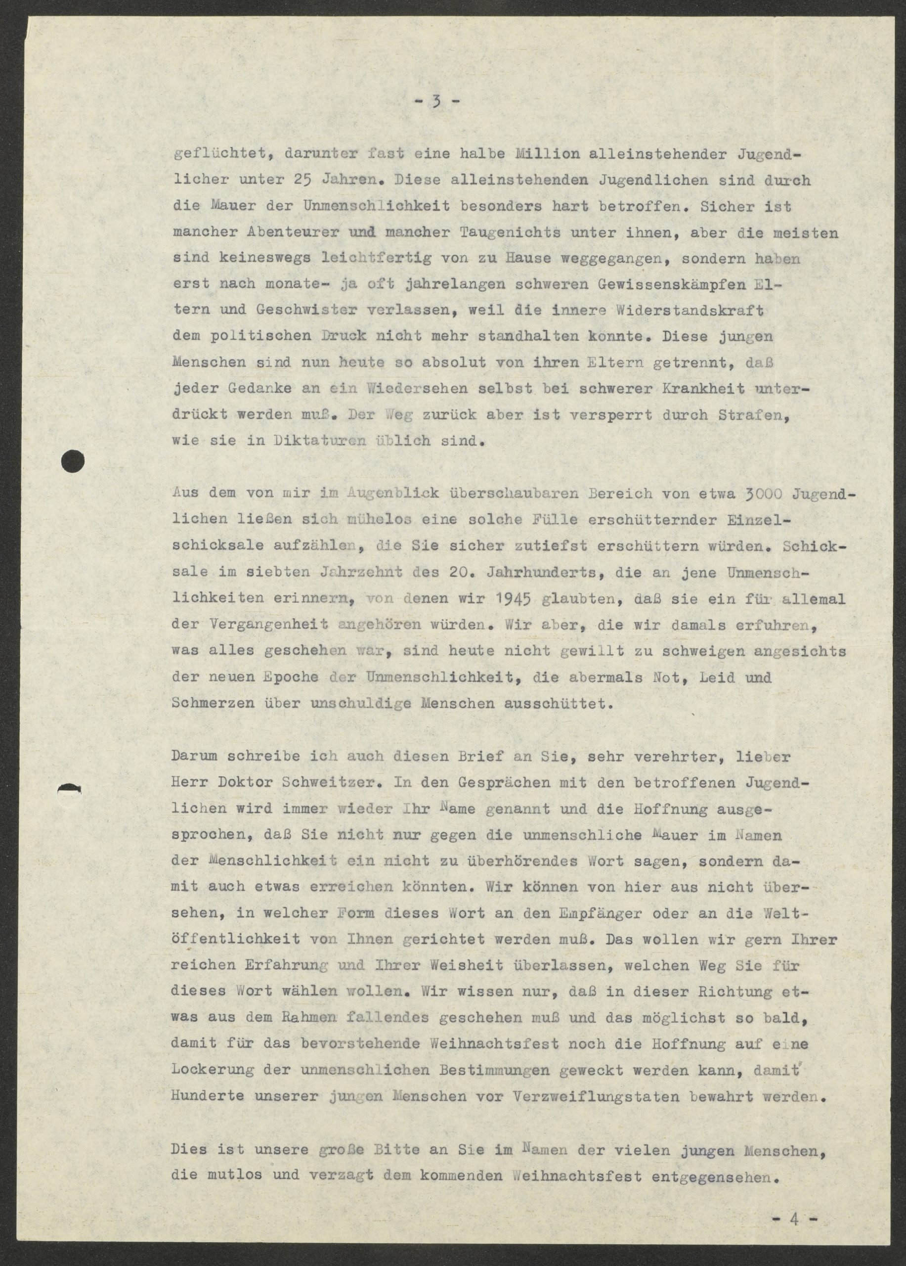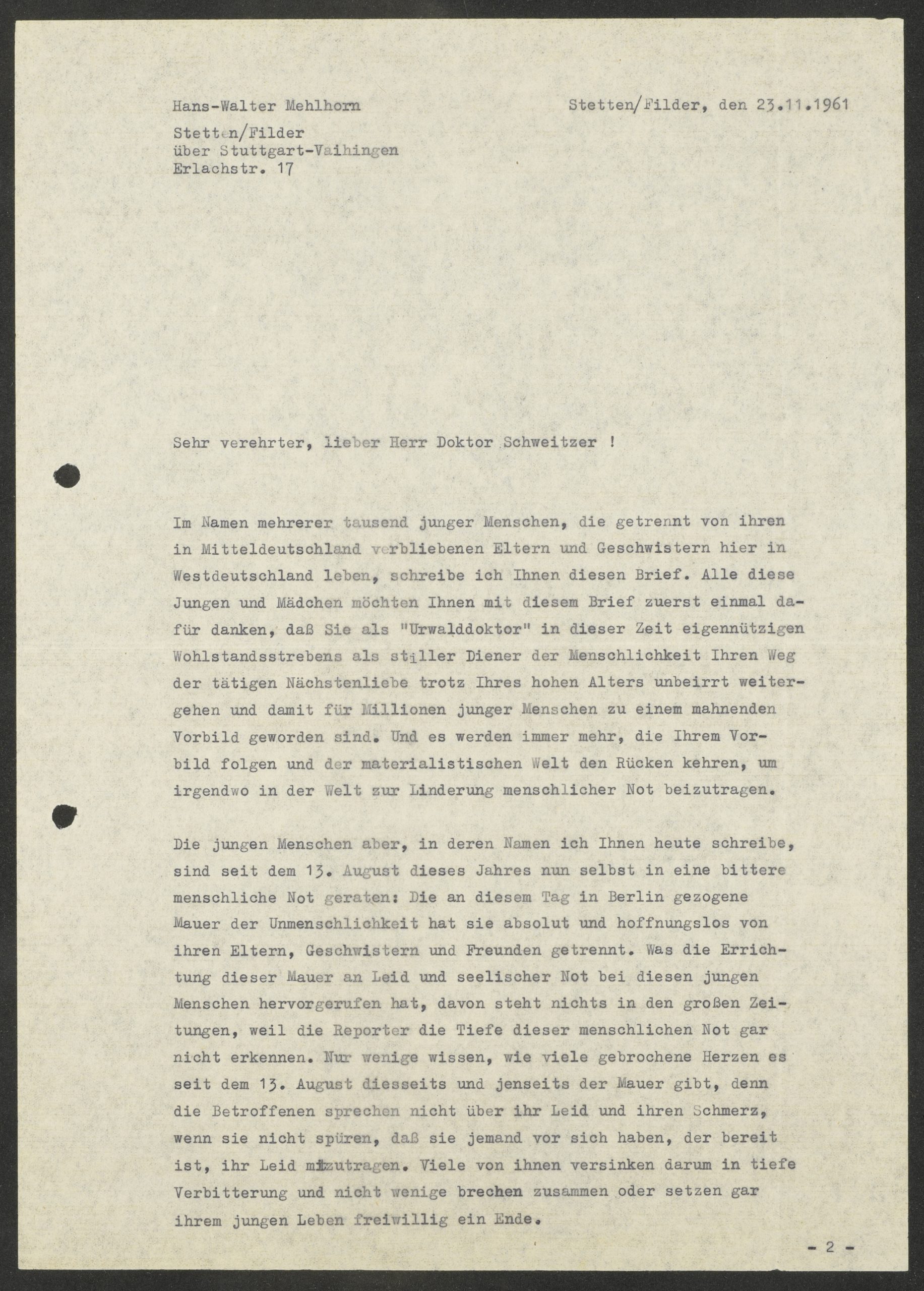 Für Menschen wie Hans-Walter Mehlhorn, dem Leiter der Evangelischen Jugendaufbaugilden in Württemberg, war es offensichtlich, dass der Mauerbau für Viele eine Tragödie bedeutete. Er arbeitete mit geflüchteten Jugendlichen aus der damaligen DDR in den Jugendaufbaugilden zusammen und wusste daher, wie sehr die Jugendlichen unter der Trennung von Eltern, Freunden und Freundinnen litten. Mehlhorn versuchte in einem Brief an den berühmten Pazifisten Albert Schweitzer, der damals als Mediziner ein Hospital im afrikanischen Urwald leitete, diesen davon zu überzeugen, dass „es Ihnen allein möglich ist, mit der Kraft des Wortes eine Bresche in die Mauer der Unmenschlichkeit zu schlagen.“ Der Briefwechsel findet sich im Bestand Diakonisches Werk Württemberg (L1).