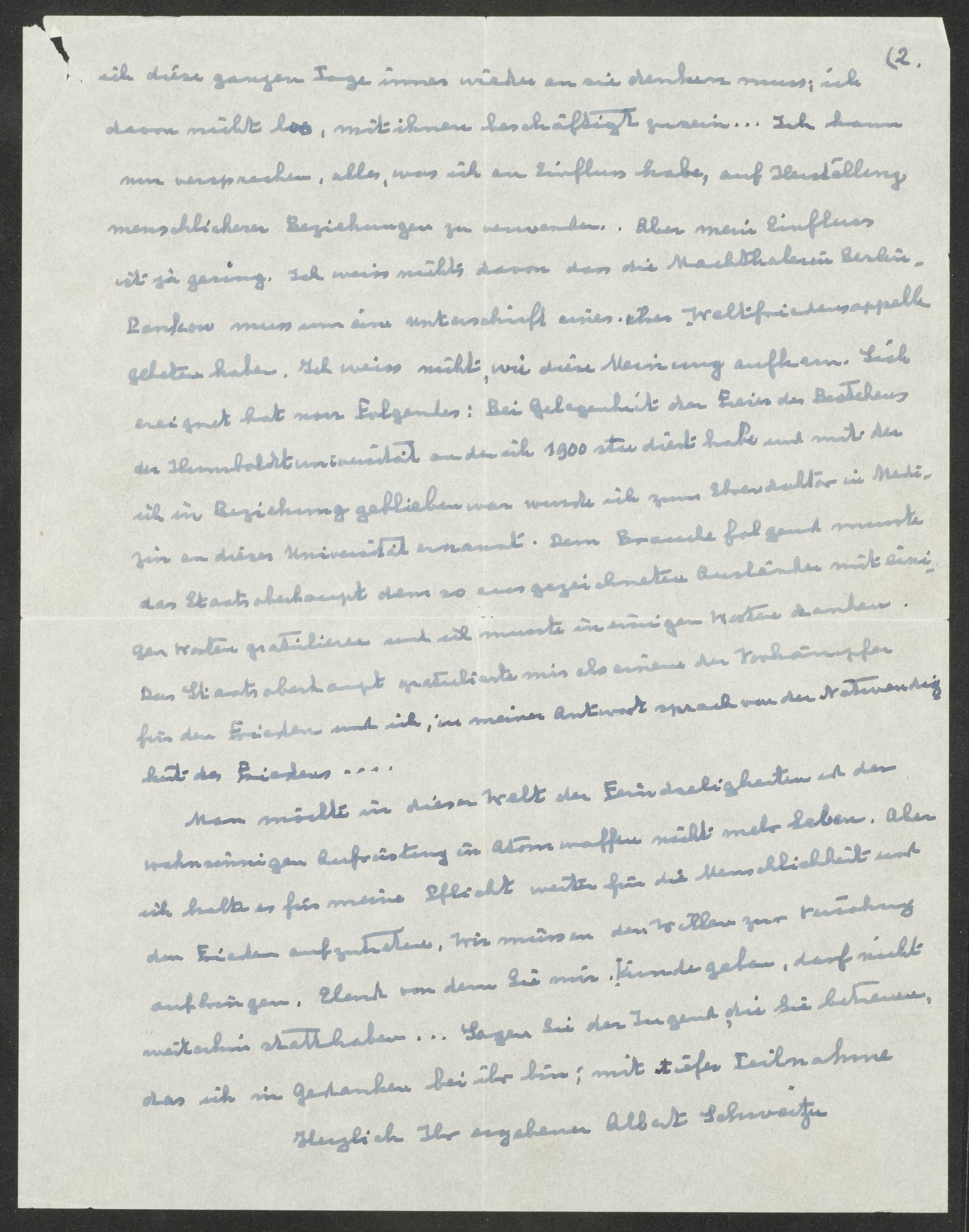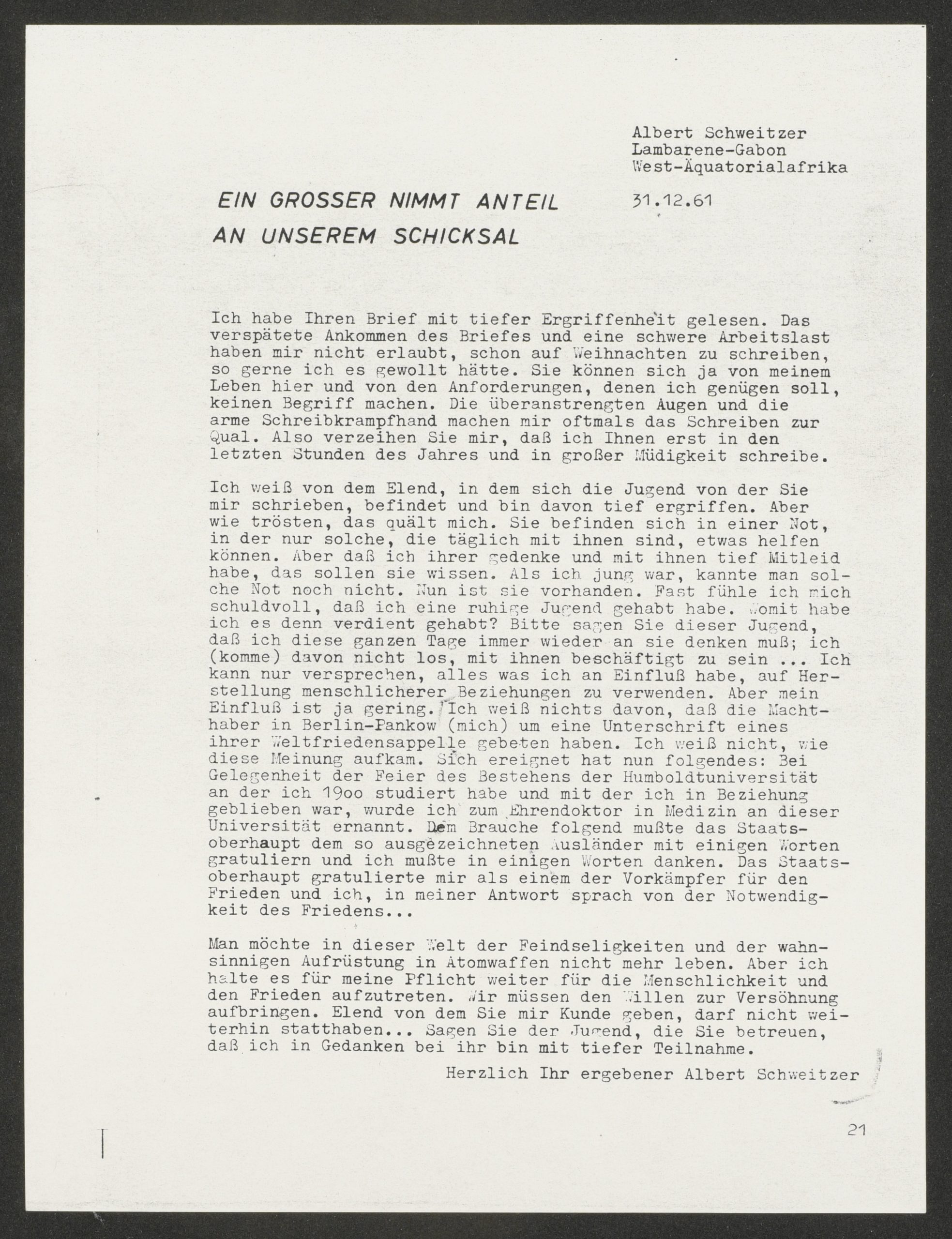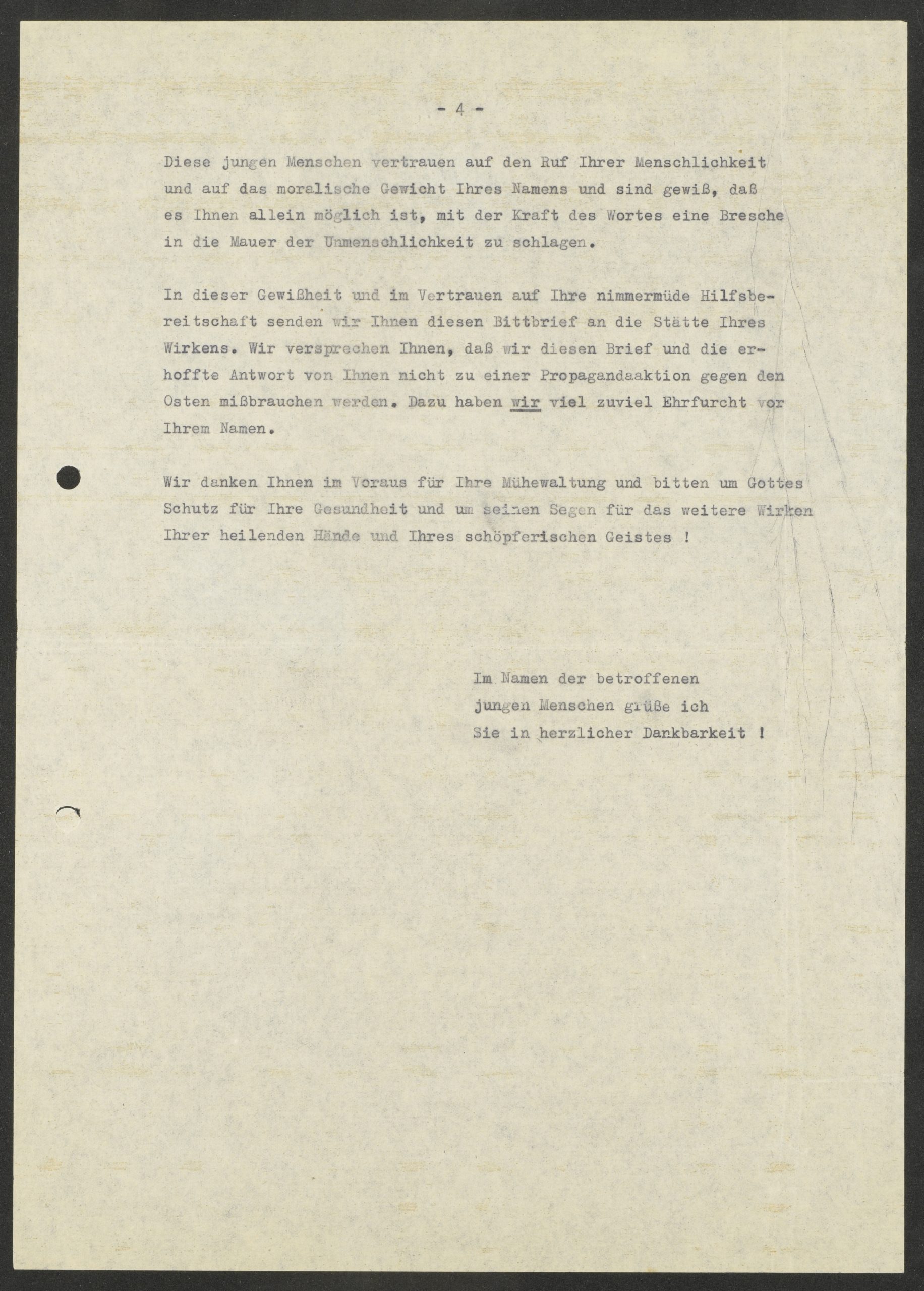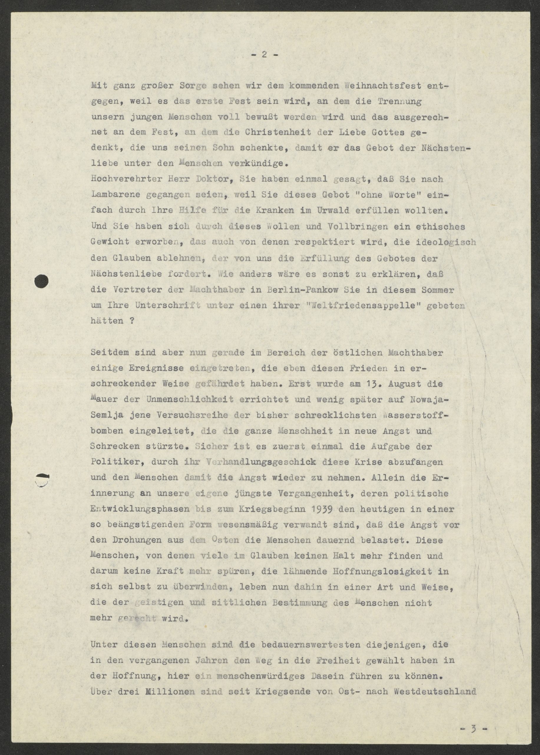 Für Menschen wie Hans-Walter Mehlhorn, dem Leiter der Evangelischen Jugendaufbaugilden in Württemberg, war es offensichtlich, dass der Mauerbau für Viele eine Tragödie bedeutete. Er arbeitete mit geflüchteten Jugendlichen aus der damaligen DDR in den Jugendaufbaugilden zusammen und wusste daher, wie sehr die Jugendlichen unter der Trennung von Eltern, Freunden und Freundinnen litten. Mehlhorn versuchte in einem Brief an den berühmten Pazifisten Albert Schweitzer, der damals als Mediziner ein Hospital im afrikanischen Urwald leitete, diesen davon zu überzeugen, dass „es Ihnen allein möglich ist, mit der Kraft des Wortes eine Bresche in die Mauer der Unmenschlichkeit zu schlagen.“ Der Briefwechsel findet sich im Bestand Diakonisches Werk Württemberg (L1).
