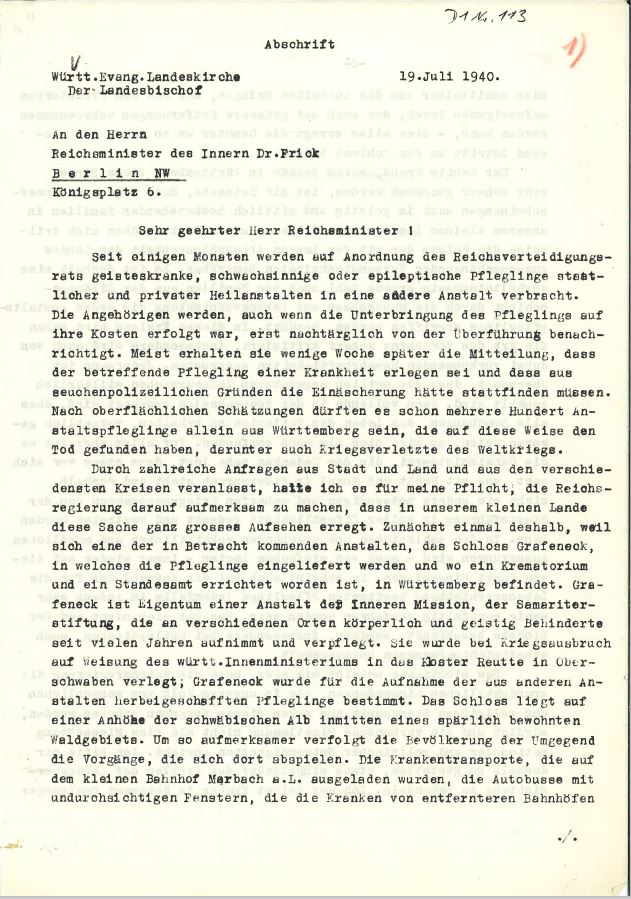 - Protestschreiben Theophil Wurms an Reichsinnenminister Frick vom 19.7.1940, Gesamtdokument mit 6 Seiten. LKAS, D1, Nr. 113.