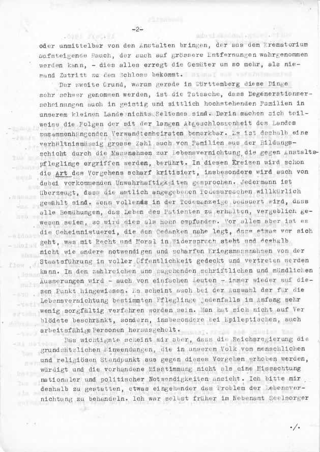 Früh wurden die wahren Hintergründe der Todesfälle bekannt. Als erster Landesbischof, aber auch erst am 19. Juli 1940, entschloss sich Theophil Wurm zu einem Protestschreiben an Reichsinnenminister Wilhelm Frick, das sich in mehreren Abschriften im Nachlass Wurms im Landeskirchlichen Archiv findet. In seinem sechsseitigen Brief stellt der der nationalsozialistischen Ideologie die christliche Ethik entgegen. Er warnt vor einem Sittenverfall, der „auch den Verfall des Staates nach sich ziehen würde“. Weitere Schreiben an hohe Partei- und Regierungsstellen folgten. Er wandte sich auch an das Oberkommando der Wehrmacht, deren Soldaten nach einer unheilbaren Verwundung ebenfalls die Euthanasie droht. Er wies darauf hin, mit dem Hinweis, welche Folgen solche Handlungen für die Moral der Truppe haben würden.