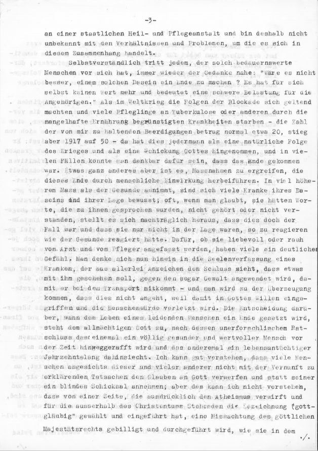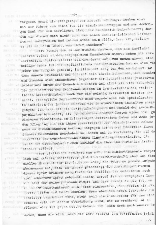 Im August des Jahres 1941 wurde die als „Aktion T4“ – benannt nach der zuständigen Dienststelle für die Krankenmorde in der Tiergartenstraße 4 in Berlin – bezeichnete systematische Tötung von psychisch kranken und körperlich behinderten Menschen, die Euthanasie, offiziell abgebrochen. Etwa 70.000 Anstaltsbewohner waren vom Beginn der Aktion Anfang 1940 bis zu ihrem Ende ermordet worden. Protest von kirchlicher Seite führte zur Einschränkung des Euthanasieprogramms.