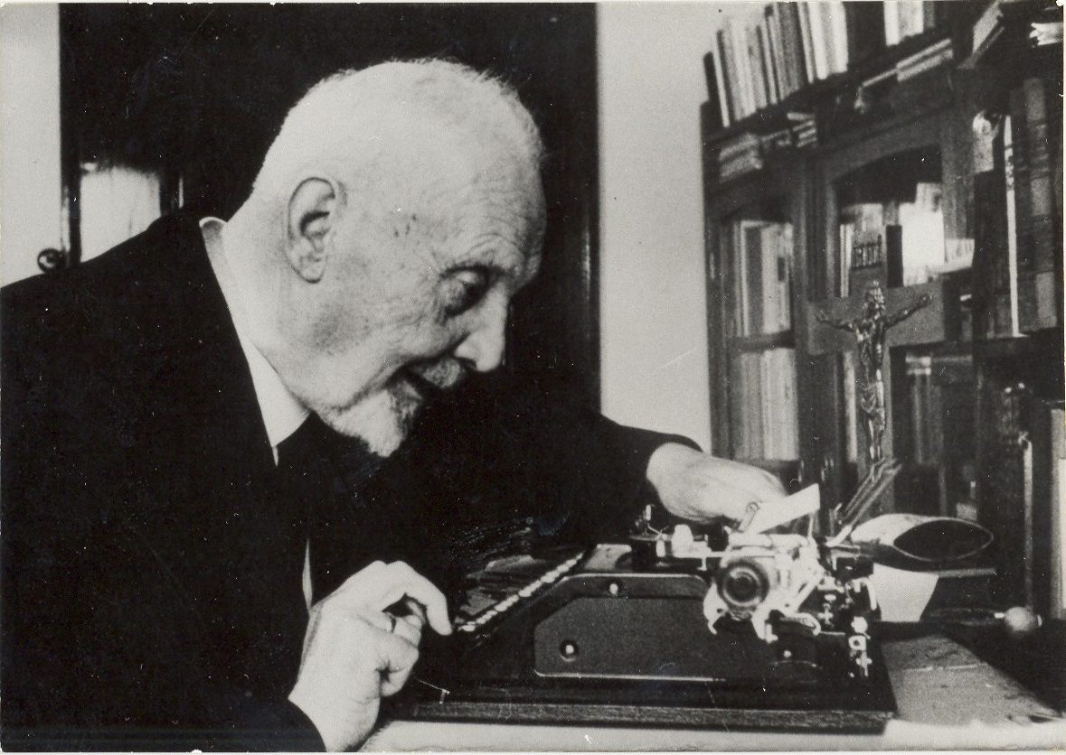 Landesbischof Theophil D. Wurm an der Schreibmaschine, an der er oft selbst die Entwürfe seiner Briefe verfasste. LKAS, Bildersammlung.