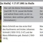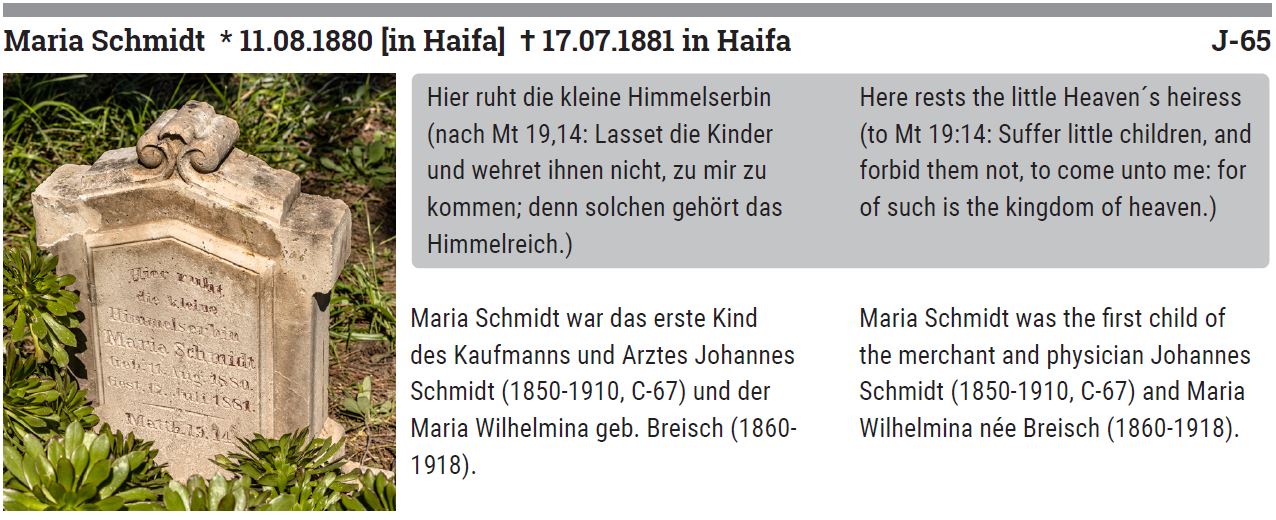 Dr. Jakob Eisler, Mitarbeiter des Landeskirchlichen Archivs, und Ulrich Gräf, Kirchenoberbaudirektor der evangelischen Landeskirche in Württemberg i.R., arbeiten derzeit an einer aufwändigen Dokumentation der Friedhöfe mit ihren Grabsteinen in Haifa und Jerusalem, sowie der aufgelösten Friedhöfe in Bethlehem/Galiläa, Waldheim im Norden; Jaffa (Mount Hope), Sarona und Wilhelma im Süden.