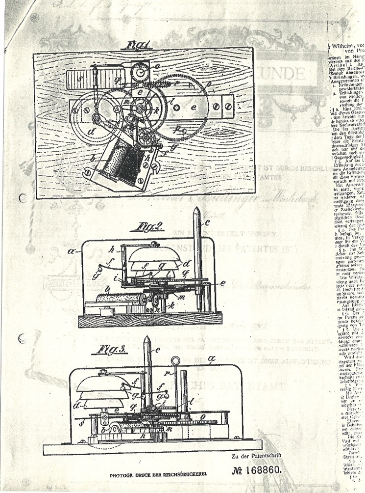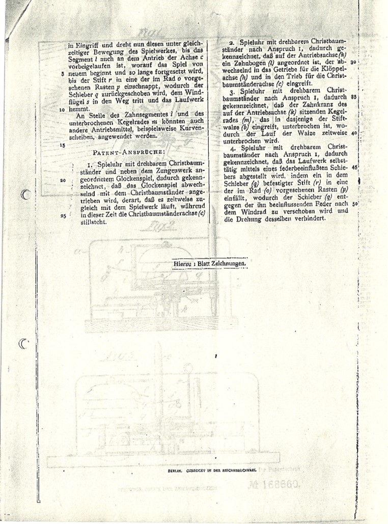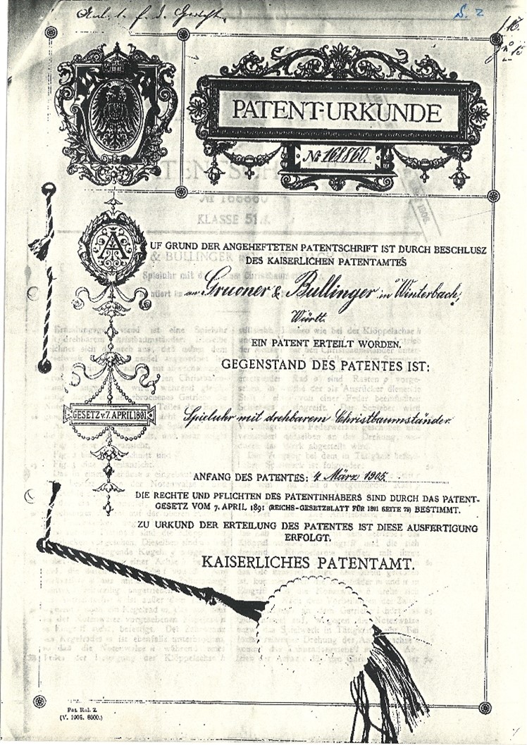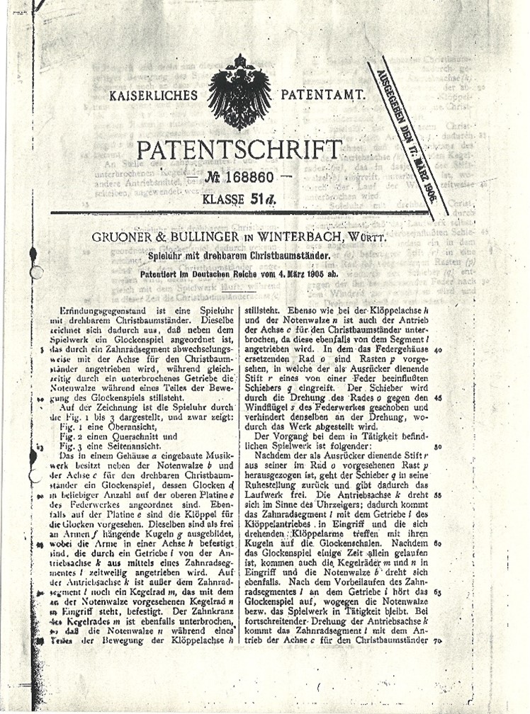 Hergestellt wurde das Wunderding in Württemberg. Die Firma Gruoner & Bullinger aus Winterbach erwarben dafür im Jahr 1905 das Kaiserliche Patent. Der „Erfindungsgegenstand“, so heißt es in der Patentschrift, „zeichnet sich dadurch aus, dass neben dem Spielwerk ein Glockenspiel angeordnet ist, das durch ein Zahnradsegment abwechslungsweise mit der Achse für den Christbaumständer angetrieben wird, während gleichzeitig durch ein unterbrochenes Getriebedurch die auch die Notenwalze während eines Teils der Bewegung des Glockenspiels stillsteht.“ Drei Querschnittszeichnungen in der Beilage veranschaulichen die komplexe Mechanik.