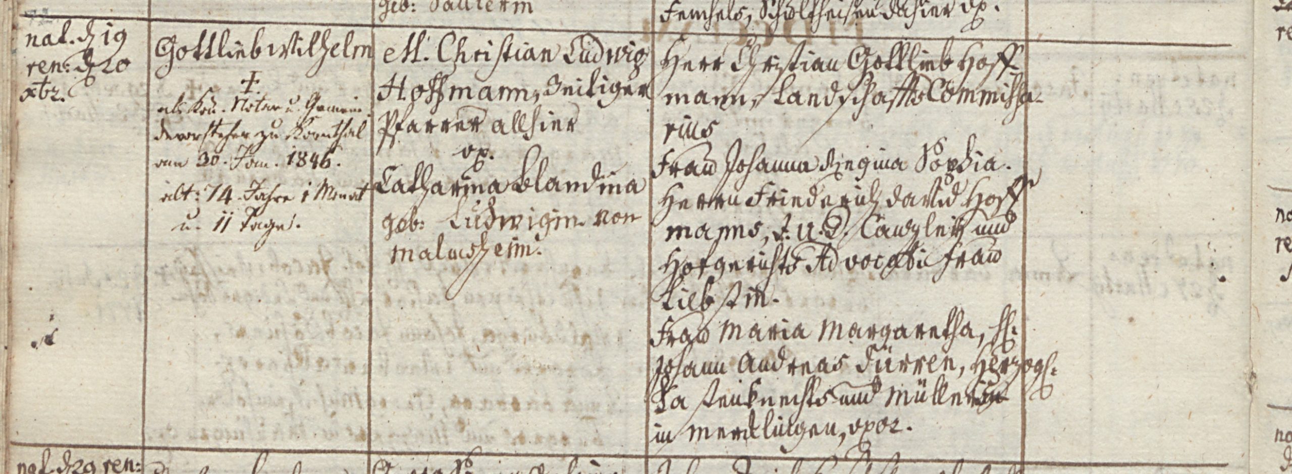 Laut Eintrag im Ostelsheimer Taufregister wurde er einen Tag nach seiner Geburt getauft („ren.“ = lat. renatus = deutsch: wiedergeboren = getauft). Eine spätere Hand hat unter seinem Namen noch eine Notiz zu seinem Tod hinzugefügt: „als kön[iglicher] Notar und Gemeindevorsteher zu Kornthal am 30. Januar 1846. alt 74 Jahr 1 Monat u. 11. Tage.“ Als Eltern werden der hiesige Pfarrer Christian Ludwig Hoffmann und seine aus Malmsheim stammende Frau Katharina Blandina Ludwig vermerkt. Der Schreiber des Eintrags dürfte der Vater selber gewesen sein, da ihm als Pfarrer des Kirchspiels die Führung des Kirchenregisters oblag.