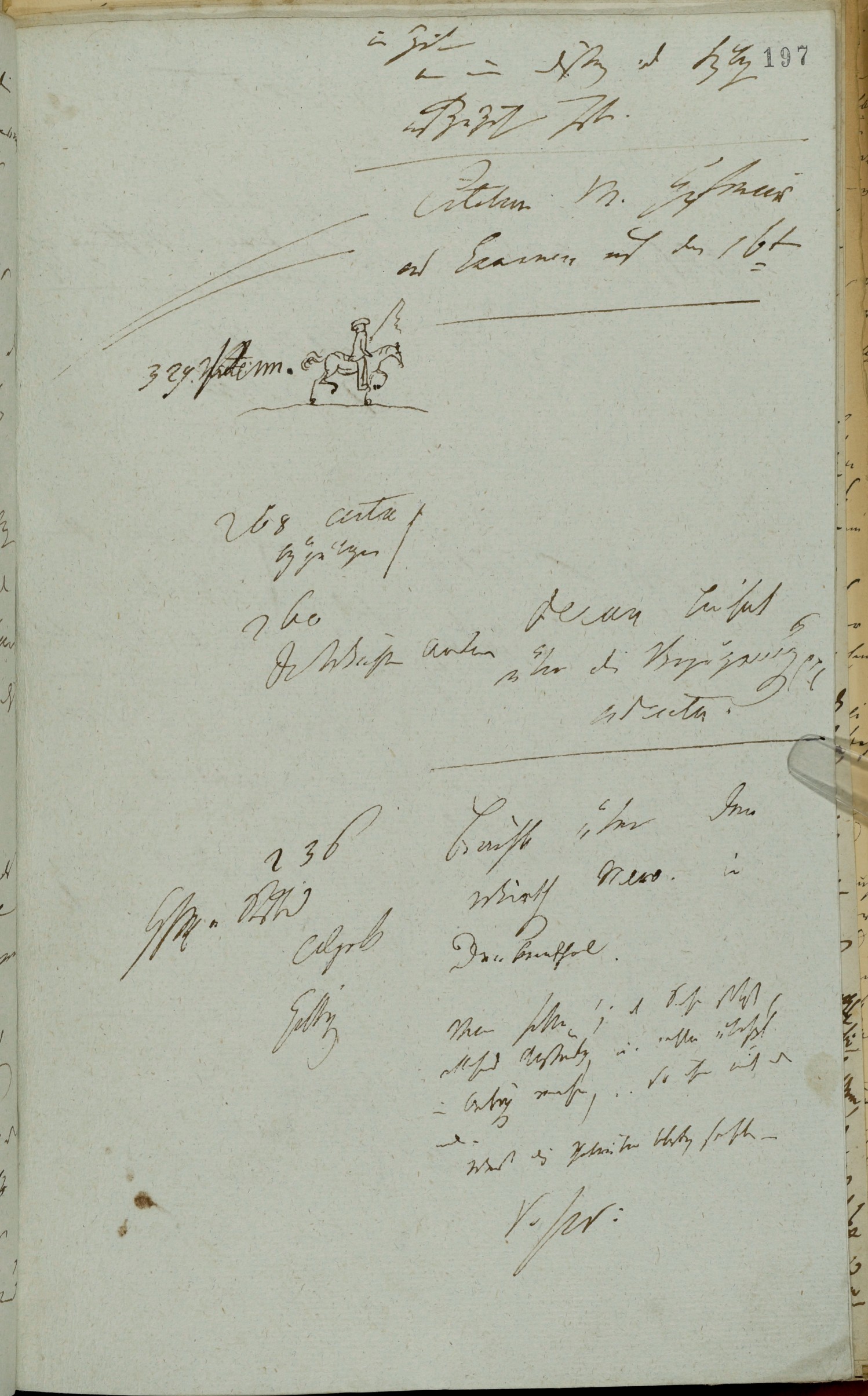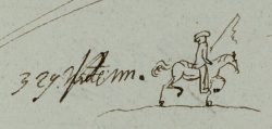 Ob es dem Protokollanten in der Sitzung des Konsistoriums am 9. Februar 1813 auch so erging? Wir wissen es nicht, aber die Vermutung liegt nahe. Aufgrund der unleserlichen Schrift ist es leider schwierig, herauszufinden, was in besagter Sitzung besprochen wurde. Auf jeden Fall hat der Protokollant zwei Zeichnungen hinterlassen. Während in der ersten klar ein rückwärts blickender Reiter mit Hut und Peitsche auf einem Pferd zu erkennen ist, hat die zweite Zeichnungen wohl unter der Dauer der Sitzung gelitten: ein Reiter auf einem Pferd ist gerade noch zu erkennen.