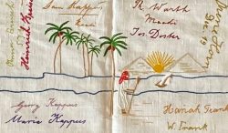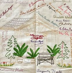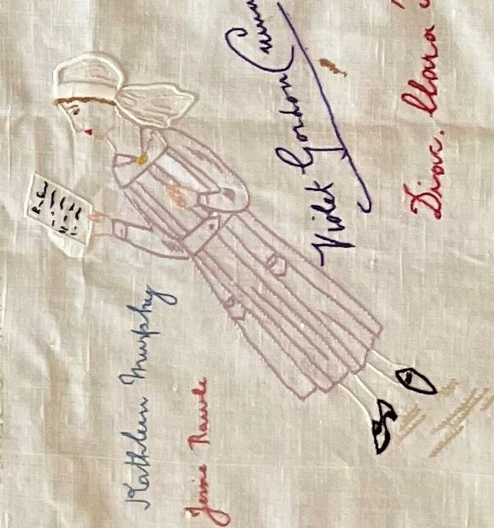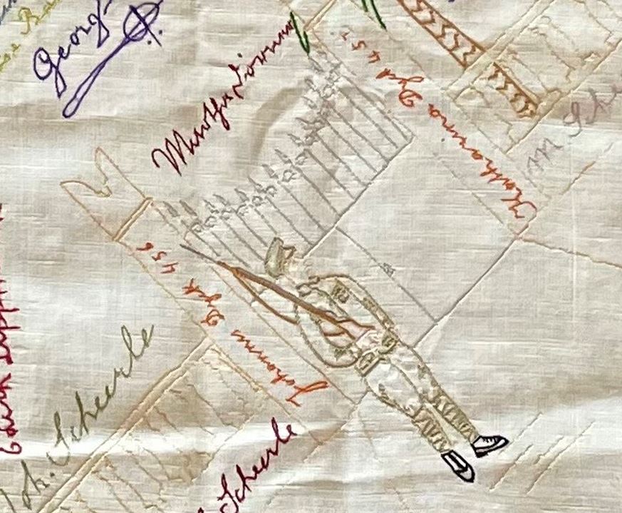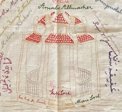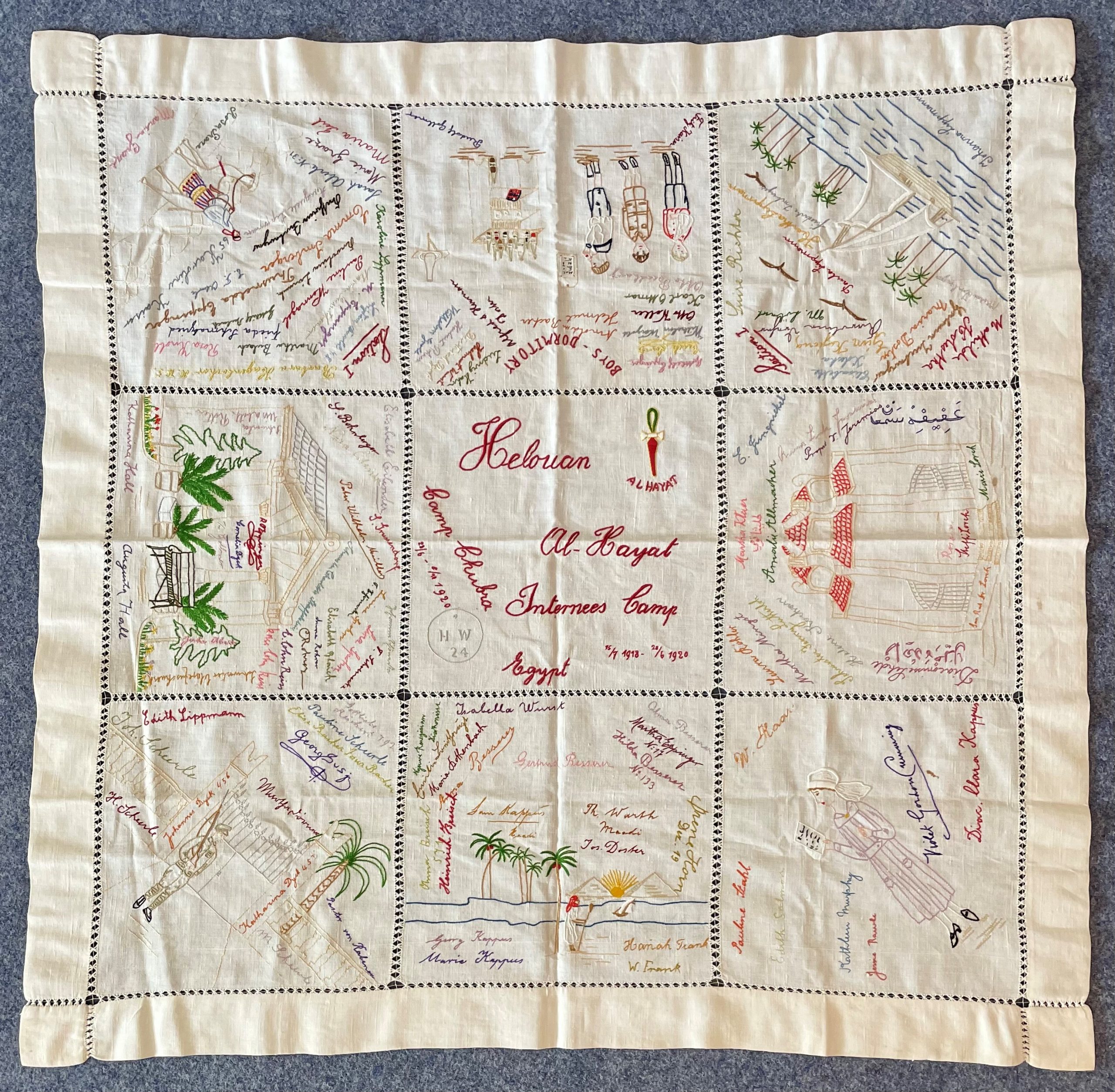 Faszinierend für den Betrachter der Stickerei ist, dass nicht nur die Namen von Internierten gestickt wurden, sondern die Unterschriften dieser Personen. Außerdem fällt auf, dass die Beschriftungen durchweg in englischer Sprache gehalten sind. Entweder die palästinadeutsche Stickerin hat sich dieser Sprache bedient, oder aber das Tuch war das Geschenk einer der englischen Helferinnen (Krankenschwestern), die für die Betreuung der Internierten zuständig waren. Mindestens auf ein gutes Verhältnis der Schwestern zu den Internierten lässt schließen, dass ein Detail des Tuches eine englische Schwester in ihrer Berufstracht zeigt, sowie sich auch mehrere englische Namen (Violet Gordon Cumming, Kathleen Murphy) in dieser Ecke des Tuches finden.