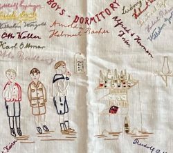 Die Szenen auf dem Tuch wirken freundlich und vermitteln eine positive Stimmung, was erstaunlich mit der Kehrseite der oben beschriebenen Bedrückung im Internierungslager kontrastiert.