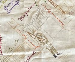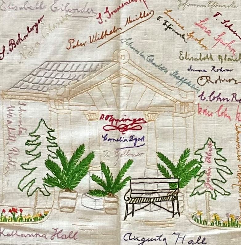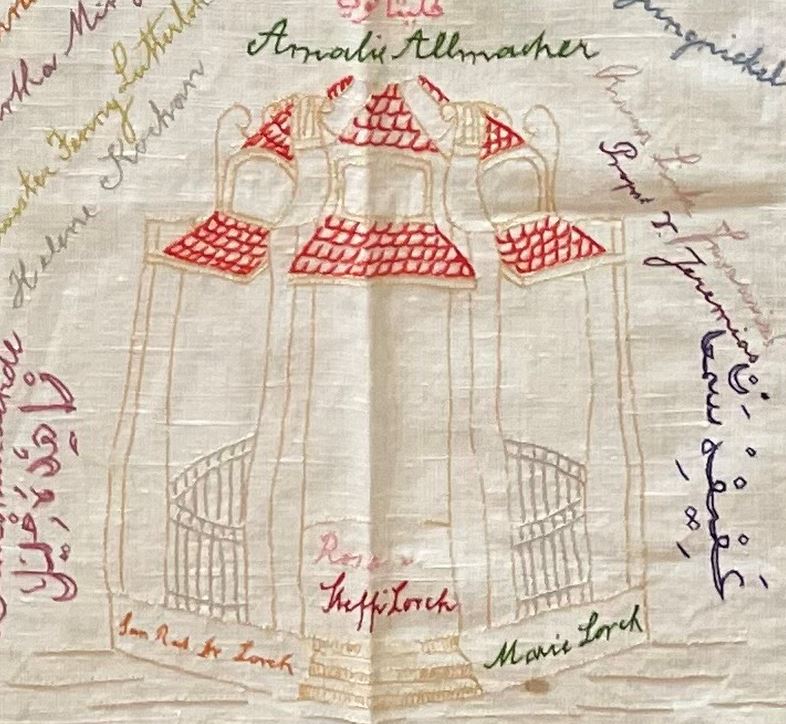 Als Schenkung der Tempelgesellschaft, Stuttgart, kam ein historisch interessantes Objekt in die Museale Sammlung im Landeskirchlichen Archiv Stuttgart. Dabei handelt es sich um ein weißes Tuch mit Lochstickerei und den Maßen 82 x 84 cm. Das Tuch ist unterteilt in neun Quadrate und enthält Stickereien der Unterschriften von mehr als 100 Mitgliedern der Tempelgesellschaft (zuzüglich weiterer palästinadeutscher Personen). Die zentrale Inschrift gibt Hinweise auf den Entstehungskontext: