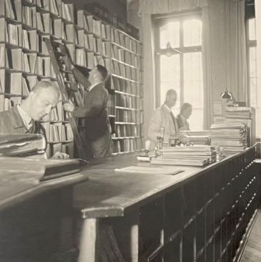 - „Ein Blick durchs Fenster zeigt uns gleich / 4 wackre Leut im Aktenreich“ (Originalbeschriftung). Registratur. LKAS, A 1, U 74