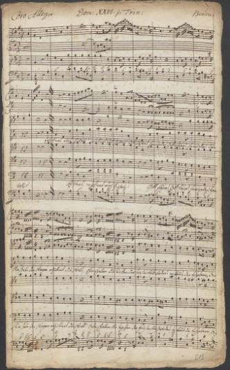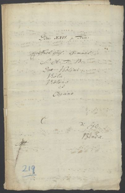 Eröffnet euch Himmel: Kantate zum 26. Sonntag nach Trinitatis. Komponiert von Georg Anton Benda nach Texten von Balthasar Münter. – 4 Singstimmen, 4 Stimmen für Streicher, 1 Stimme für Orgel und Partitur. Handschriftlich. – 36 x 21,5 cm, Landeskirchliche Zentralbibliothek, Schorndorfer Musikhandschriften: 219