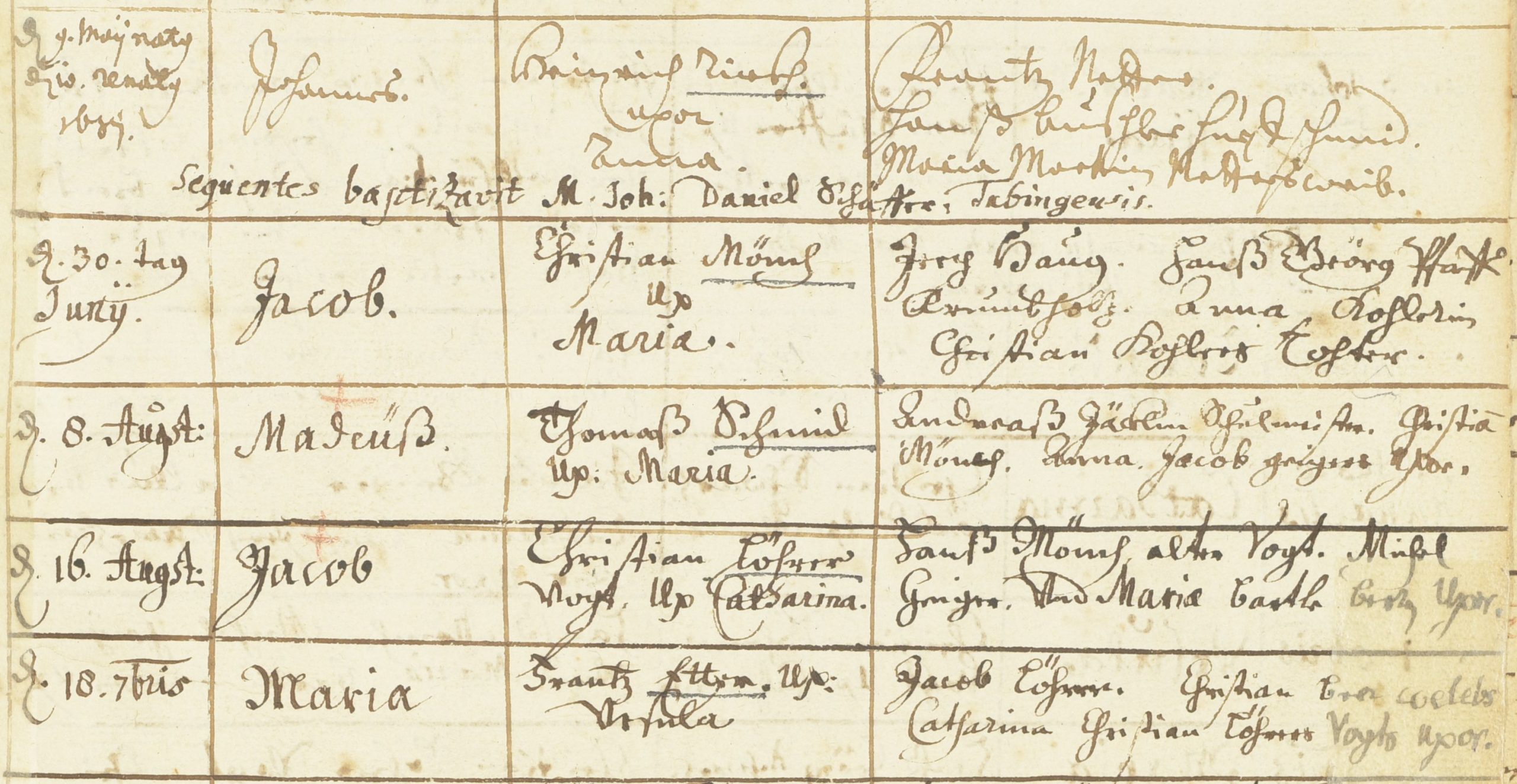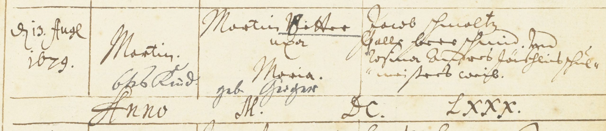 In den Taufeinträgen zu den am 13. August 1679 und an Pfingsten (6. Juni) 1683 getauften Kinder von Martin (N)Etter lautet der Name der Mutter Maria. Die Paten waren Jacob Schmaltz, Gallus Beer (Schmied) und Rosina, (Andreas Jäschlins) Schulmeisters Weib. [7] Hier helfen auch die zusätzlichen, von zweiter Hand eingetragenen Angaben „6tes Kind“ bzw. „8tes Kind, II. Ehe“ und die Ergänzungen zur Mutter „geb. Geiger“ bzw. „geb. Geiger [durchgestrichen und korrigiert zu:] Maier“ weiter, wenn auch die Frage nach dem siebten Kind und die Korrektur des Nachnamens weitere Recherchen erfordern. Hierüber kann die Personengleichheit ebenfalls bestätigt werden.