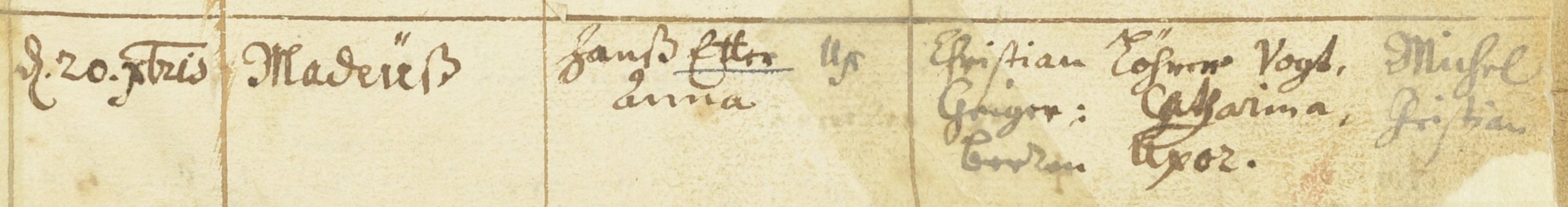 Anhand der folgenden Beispiele zu Hanß, Frantz und Martin (N)Etter ist ersichtlich, wie die Personengleichheit anhand der Übereinstimmung der anderen in den Taufeinträgen genannten Personen – die Mutter, die Paten und die Patin – bestätigt werden kann. Dies ist sinnvoll, wenn man bei der genealogischen Recherche auf solche oder ähnlich gelagerte Fälle trifft, wenn man also – da bekanntlich chronologisch rückwärts recherchiert wird – nach einer jüngeren Namensvariante sucht, aber nur noch eine andere, ältere Namensvariante findet.