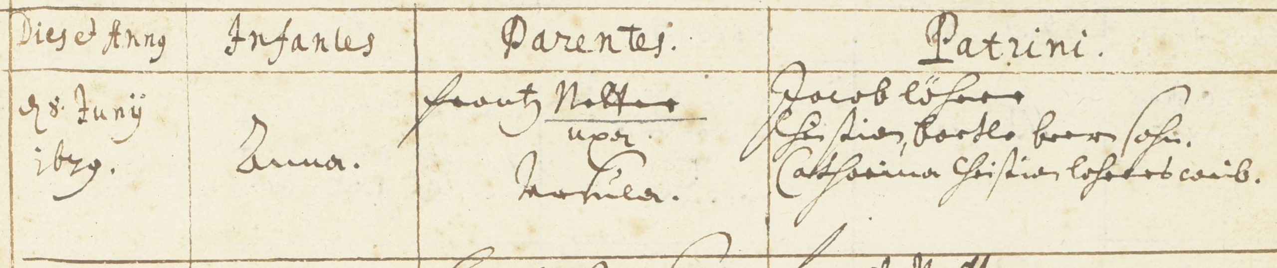 Das Bild rechts zeigt den Schnitt im Taufregister. Am 10. Mai 1681 („renatus“) heißt der erste Paten Frantz Netter, in derselben Tabellenzeile hat Pfarrer Schäffer den Pfarrerwechsel eingetragen. Am 18. September 1681 ist dann die Taufe eines Kindes eines Frantz Etters eingetragen.[3]